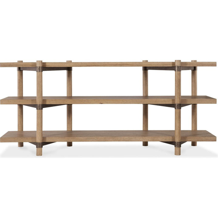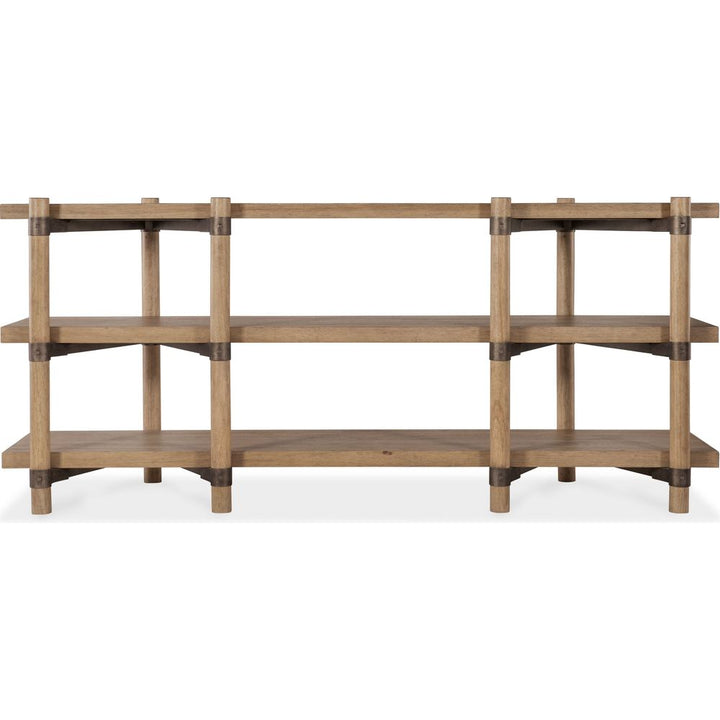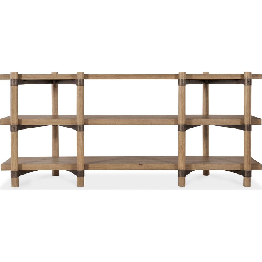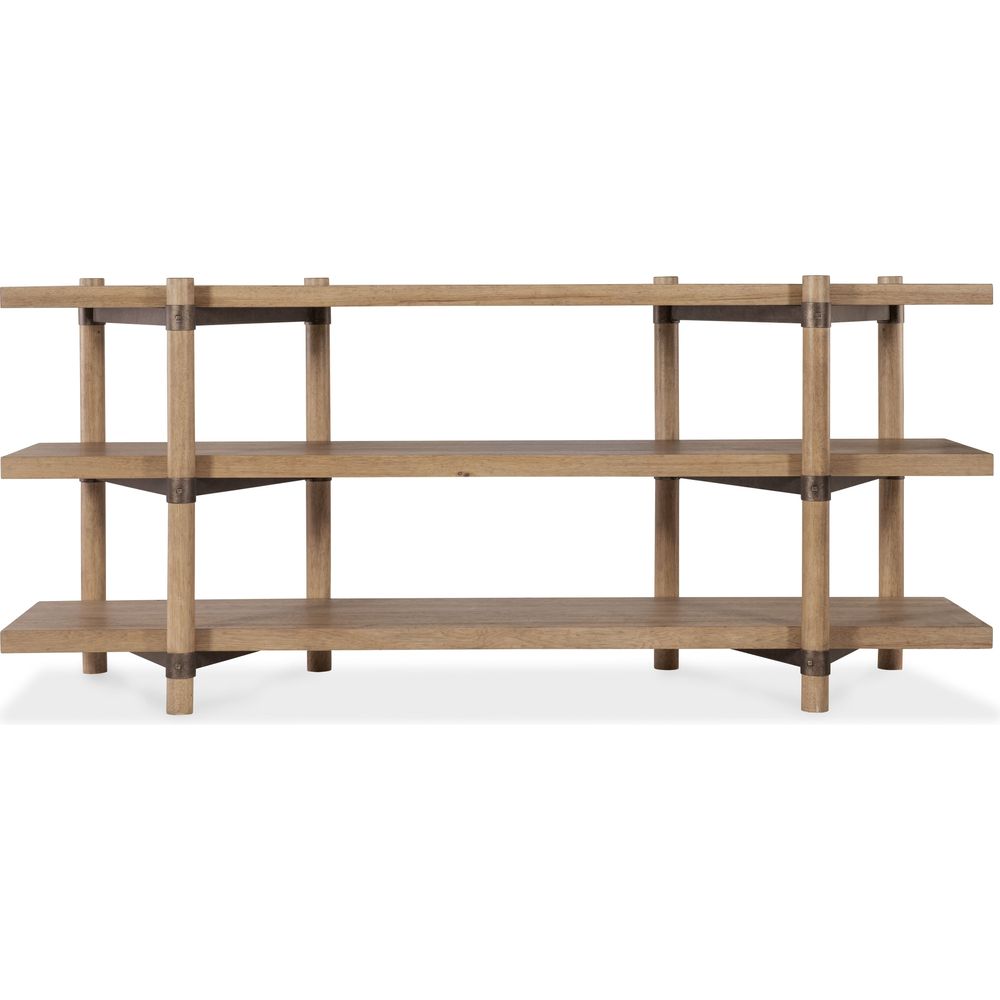 Description: Inspired by the casual wine country lifestyle and the craftsman architecture of the Napa Valley, the Terrace Row Console is crafted of Pecky Hickory Veneers with rustic hammered metal bracket accents and finished in the light-and-airy Sonoma. Featuring two fixed shelves, it can be used from either side and accommodates up to an 80-inch TV.