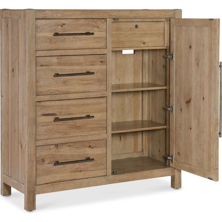 Description: Inspired by the organic beauty of California wine country, the Terrace Row Four-Drawer Door chest is crafted of Pecky Hickory and White Oak Veneers with a simple but elegant design. Finished in the light and airy Sonoma, it has rustic hammered bar pulls and four self-closing drawers and one door with soft-close hinges and a magnetic catch. Behind the door is one self-closing drawer with a lock and two adjustable wood shelves.