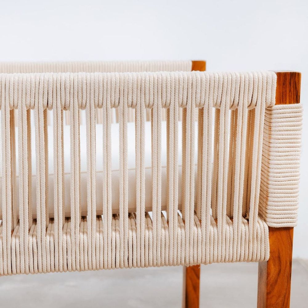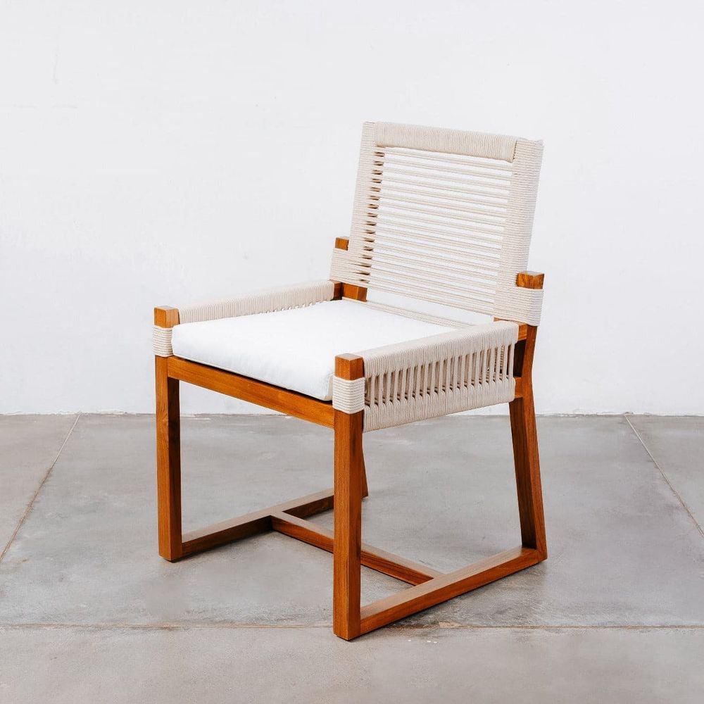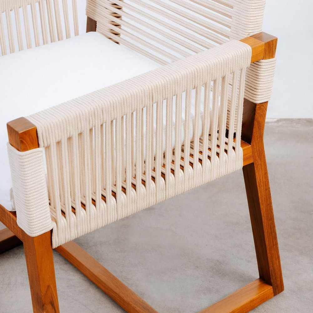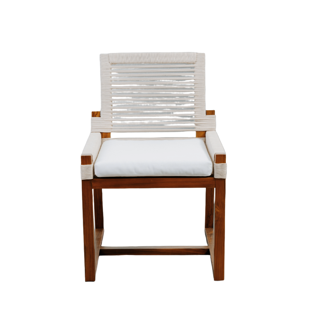 This unique dining chair will look amazing in modern and contemporary style spaces alike. A teak wood frame provides ample support for the rope back and arms. Foam cushioning is upholstered in a neutral beige finish.Available in both side and armchair styles.