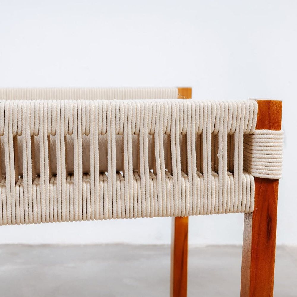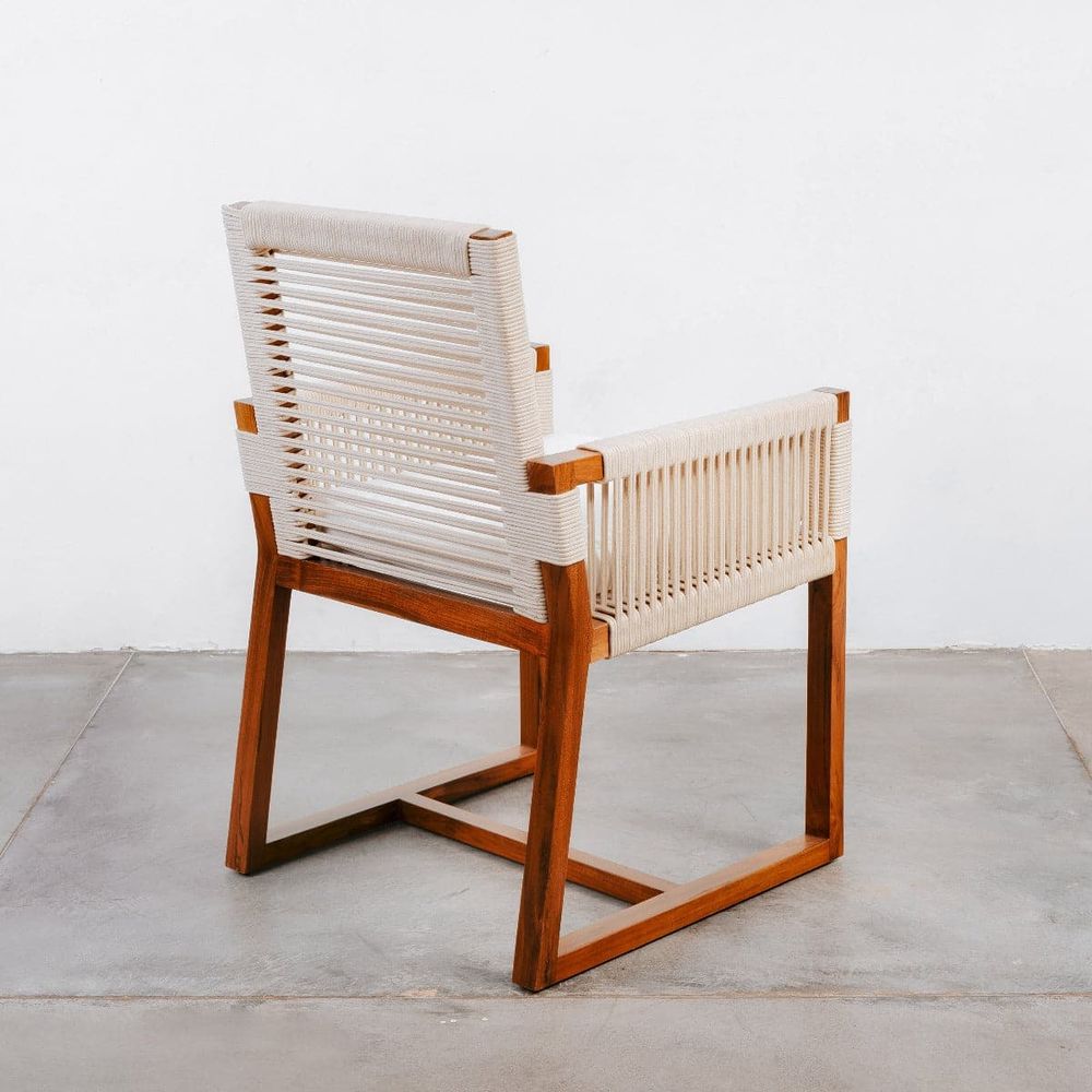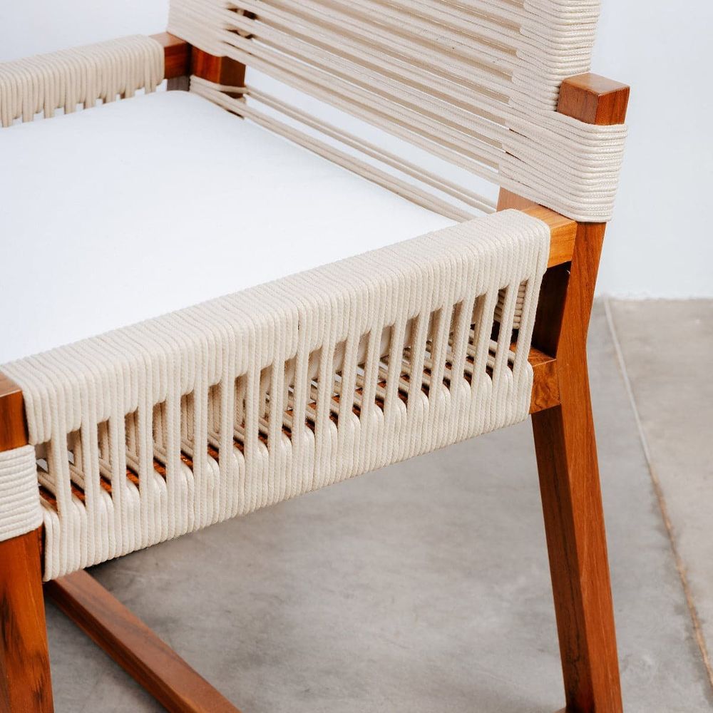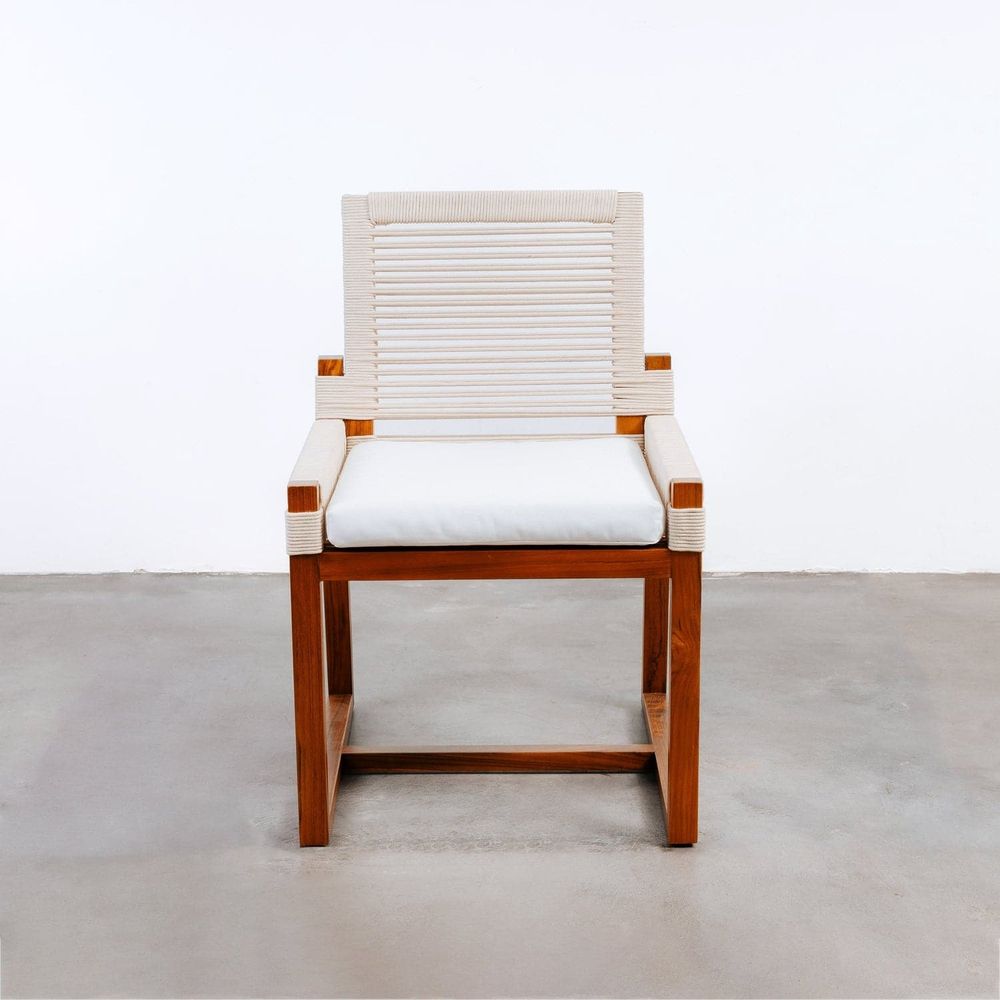 This unique dining chair will look amazing in modern and contemporary style spaces alike. A teak wood frame provides ample support for the rope back and arms. Foam cushioning is upholstered in a neutral beige finish.Available in both side and armchair styles.