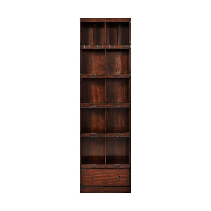 A Campaign office bookcase, with four pigeonholes, eight shelf sections and one drawer with brass fittings. The original Victorian.
