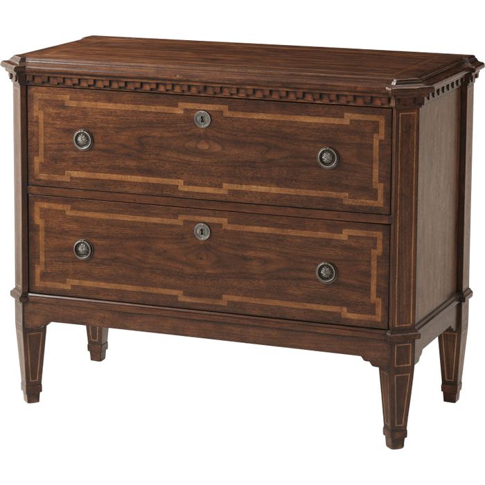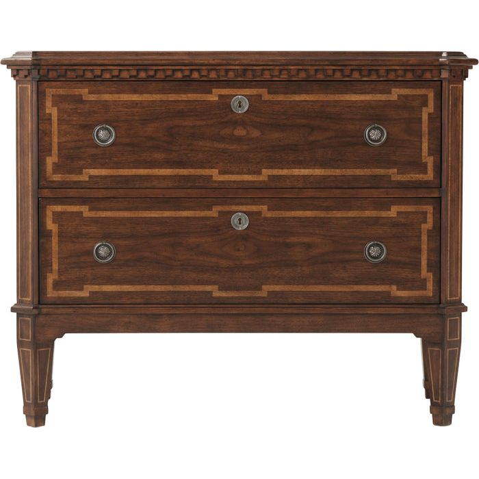 Beech and Veneered Molded Edge Top with Canted Corners Dentil Molded Frieze above Two long Drawers with Antique Pewter Handles Angled Tapering Spade Legs.Theodore Alexander is shaped by English Heritage handcrafts furniture and accessories for your home with uncompromising quality. They also believe that the person who owns a piece of Theodore Alexander Furniture should take comfort in knowing the item can be viewed from any side and they have made the piece by using a time-honored, handcrafted method that is the true mark of high quality. Every piece of Theodore Alexander has a story just waiting to be shared.