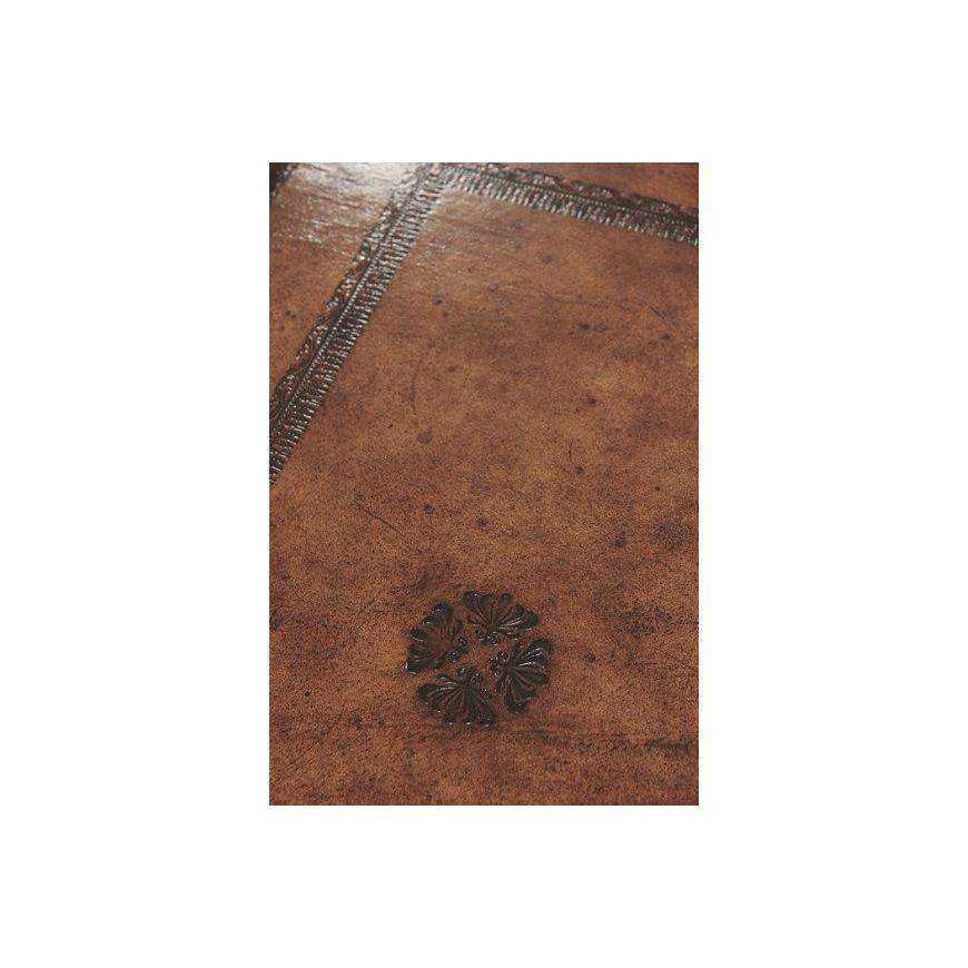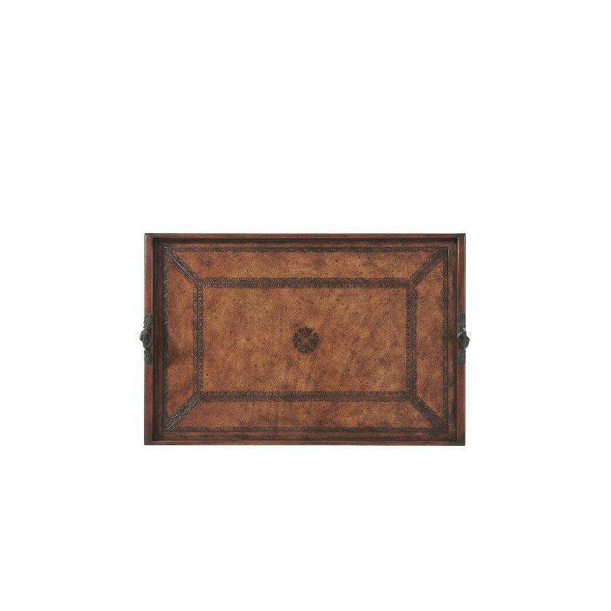 A brown tooled leather covered tray of rectangular shape with gallery and brass handles of clasping hands. The original Victorian.
