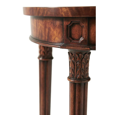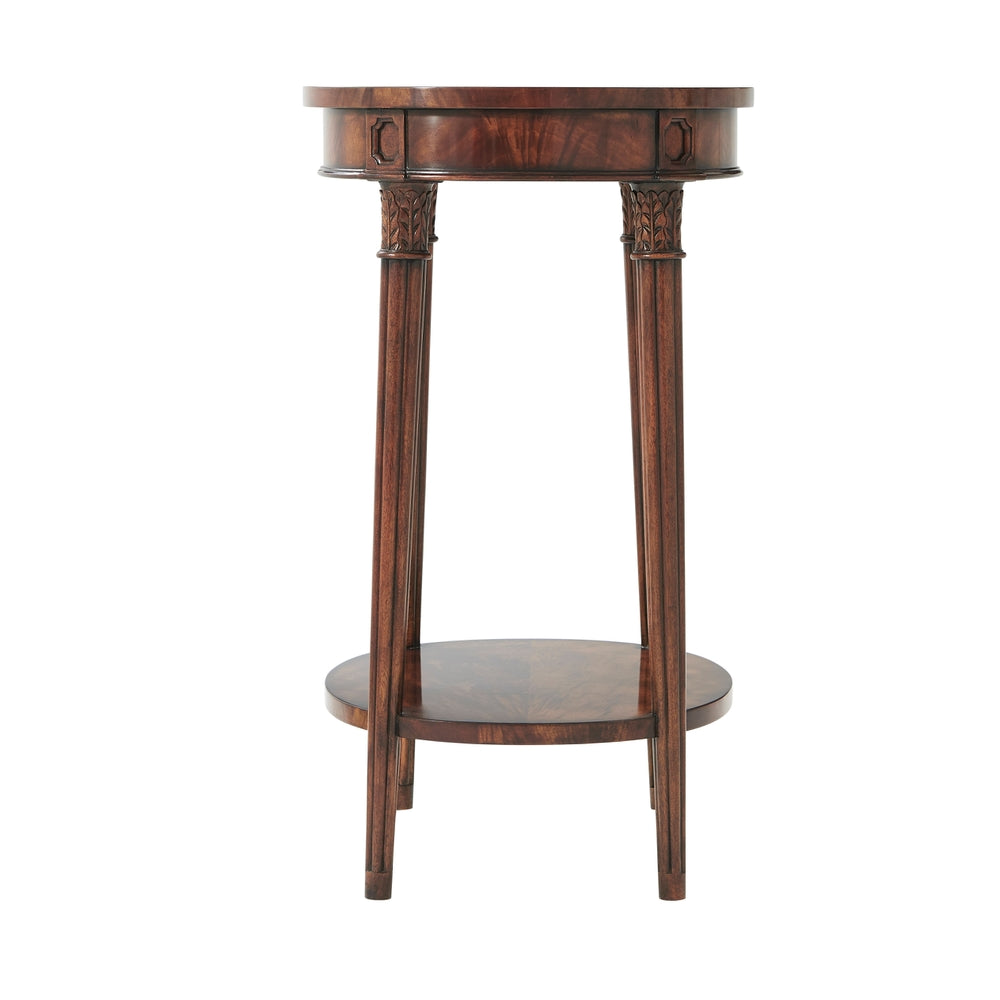 A flame veneered and mahogany lamp table, the oval top on gently splayed acanthus capital and reeded tapering legs joined by an undertier.