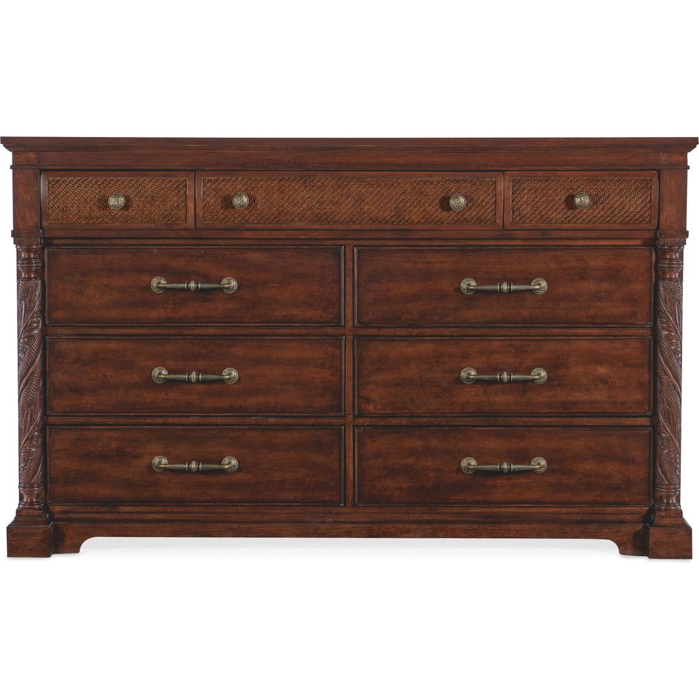 Description: The tropical craftsmanship and botanical carving of the West Indies meets southern charm with the Theodore Nine-Drawer Dresser. Crafted of Cherry Veneers, Cane and Resin, the top three drawers have cane insets on the drawer fronts and removable felt liners inside. Front posts on either side have leaf motif carving. The center top drawer has a removable felt jewelry tray and the bottom two drawers are cedar-lined. The dresser is finished in Maraschino Cherry using natural grain Cherry Veneers showcasing a dramatic cathedral structure with naturally occurring knots to deliver a rich warm finish and a smooth sophisticated aesthetic. The round knob and bar pull hardware is finished in an antique bronze.