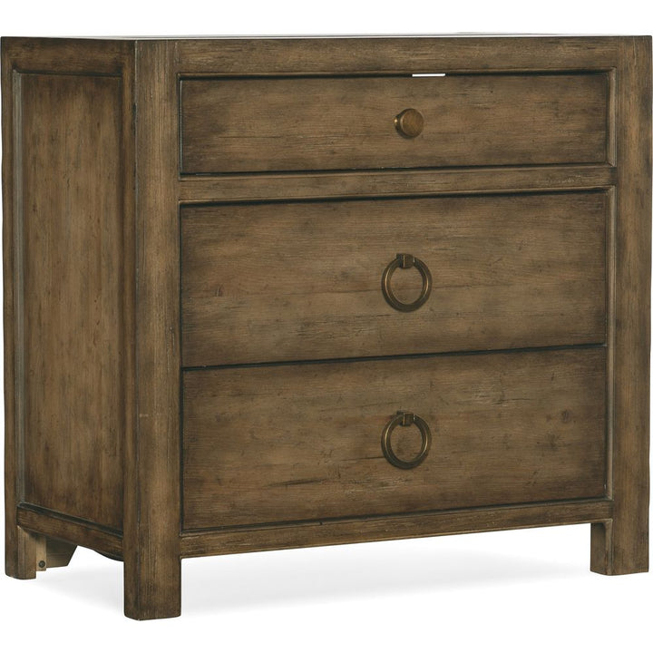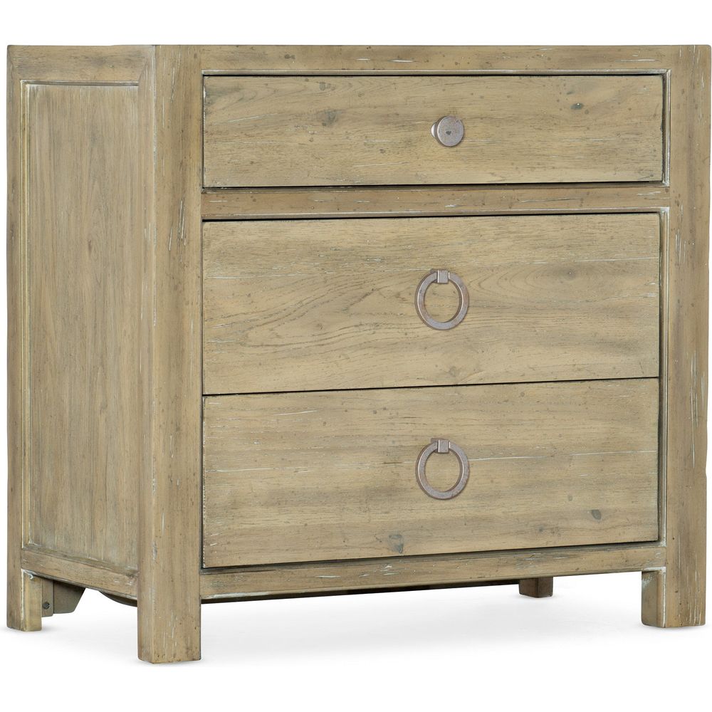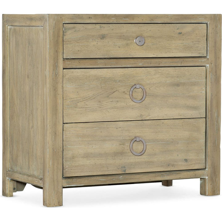 Inspired by the rugged, earthy and picturesque Malibu landscape, the Surfrider Three-Drawer Nightstand offers a simple yet stylish silhouette crafted of Pecan Veneers and finished in the light natural Driftwood finish. Featuring three self-closing drawers, the top drawer has a removable felt liner, and there's an FC707 three-plug outlet with USB port, phone clip and a light underneath the nightstand with three-intensity touch switch activation. Accented by nickel-colored bronze rings and knob pulls. Melding the salty, yet cozy oasis of the California coastline with a modern surf culture, Surfrider is defined by the use of natural materials including rattan, jute rope, stone, gypsum, bamboo and driftwood motifs. Designed to create relaxing spaces to escape from the pressures of modern life, it is featured in a light, natural Driftwood finish. Luxurious materials, shapes and textures combine to create a relaxed, yet sophisticated style that epitomize the lifestyle of a casual, beach-town community.