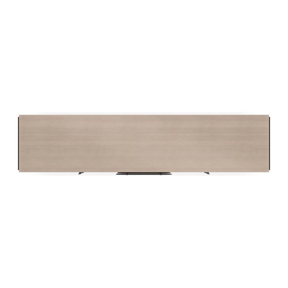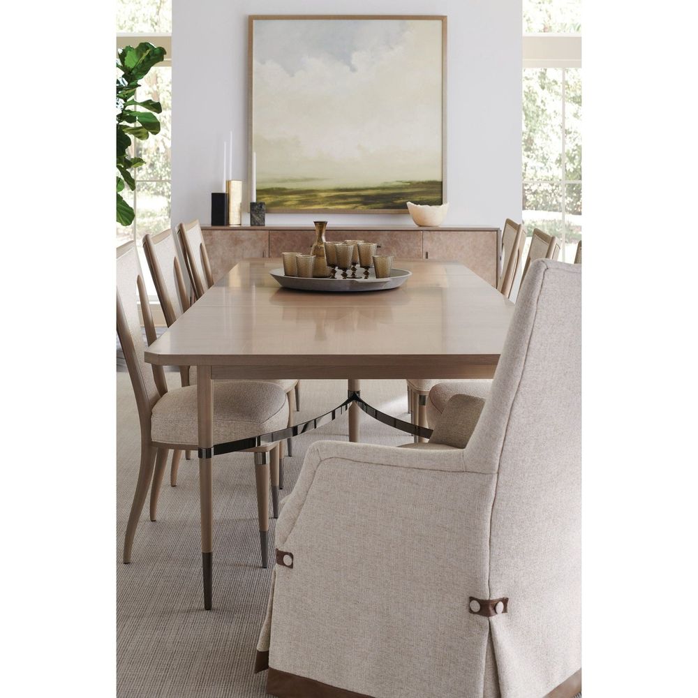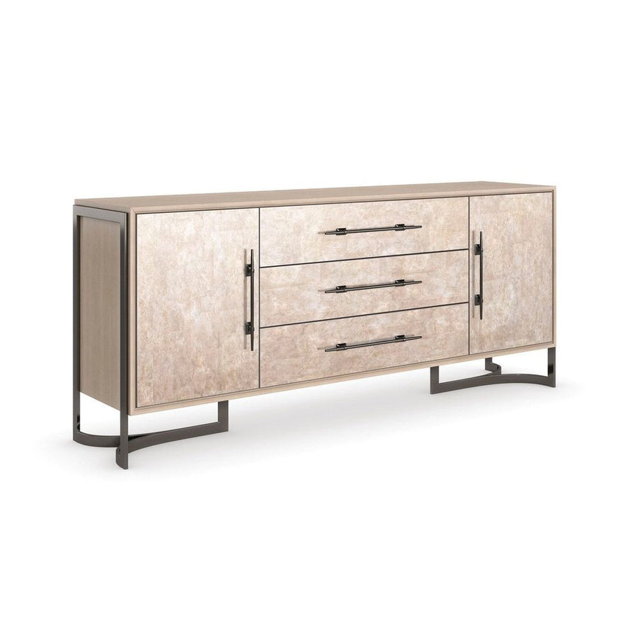 An elevated take on a casual, clean-lined design, this buffet makes an organic statement in an alluring material mix. Emulating the shimmer of mica minerals, the doors and drawer fronts are crafted in randomly pieced Amber Silverleaf, accentuated by a hand-brushed bronze finish. Its Deep Bronze metal frame and legs with arching stretchers, perfectly complement our Here to Accommodate dining table. Features ample storage for keeping linens, serveware, and other entertaining essentials.