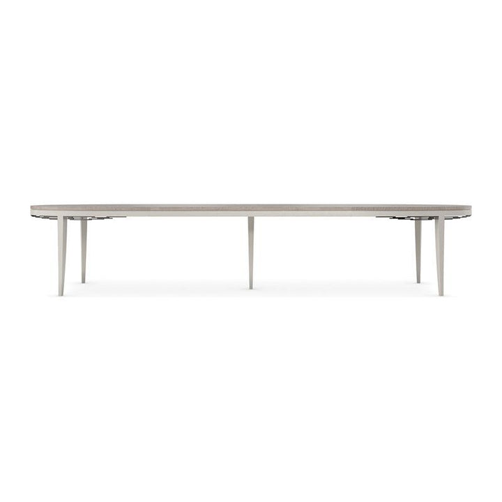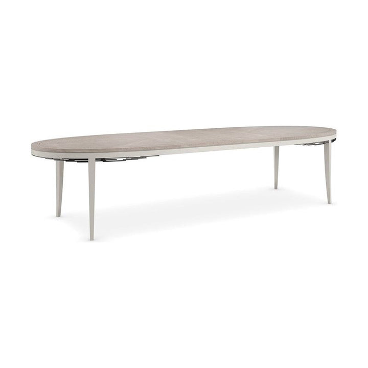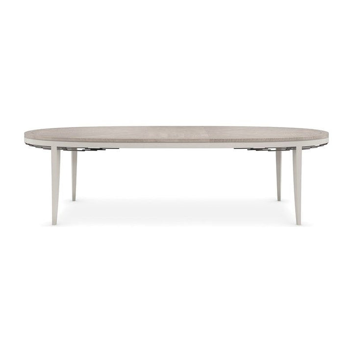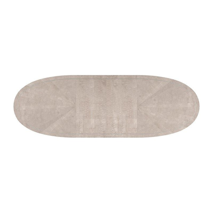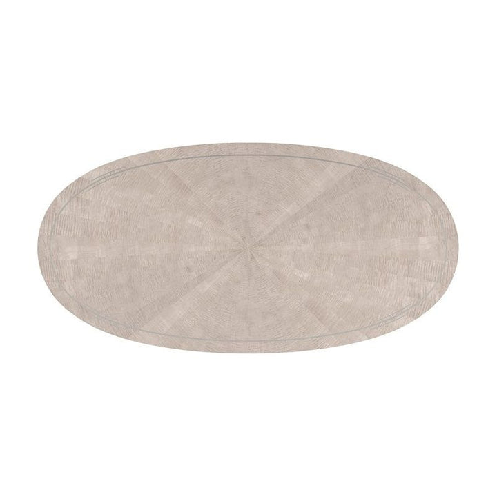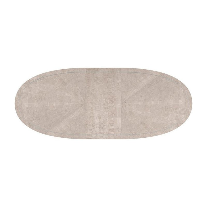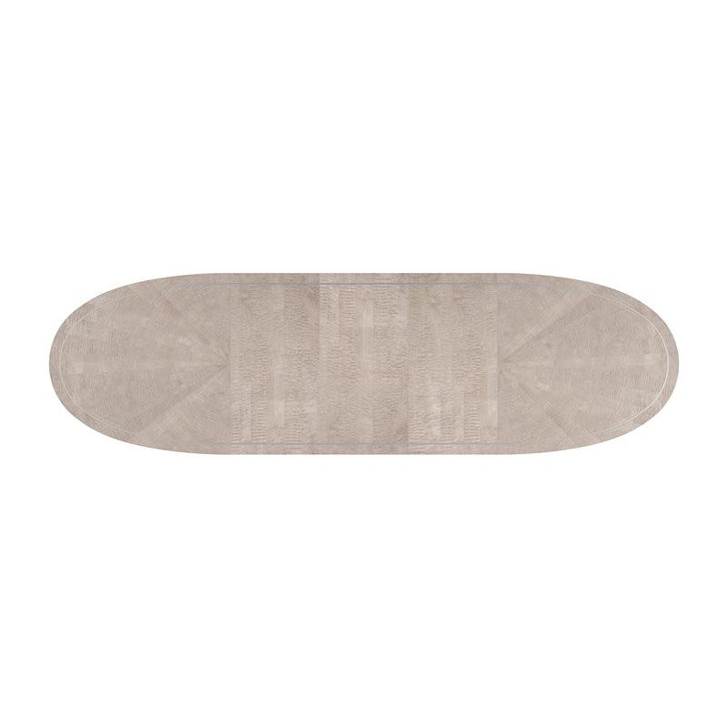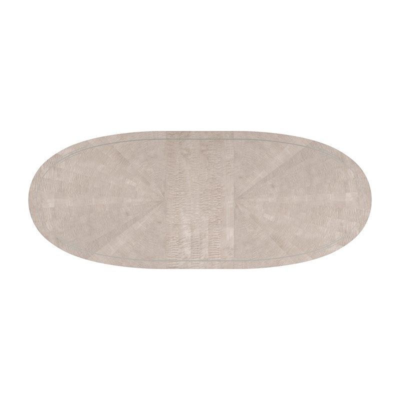 This spacious, oval-shaped dining table makes an elegant statement with a radiating pie veneer pattern on top, intricately crafted from Grey Curly Maple. A neutral Chinchilla finish gives light to flaring wood grains, delicately framed by a silkscreen pinstripe detail in Soft Silver Paint that repeats the decorative metal fretwork beneath the apron. Includes three 22" leaves that allow you to easily extend the table and seat up to 12 guests.