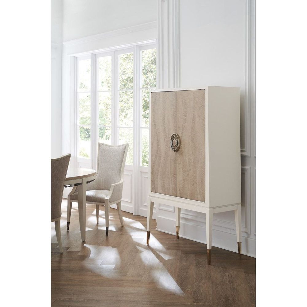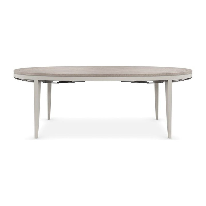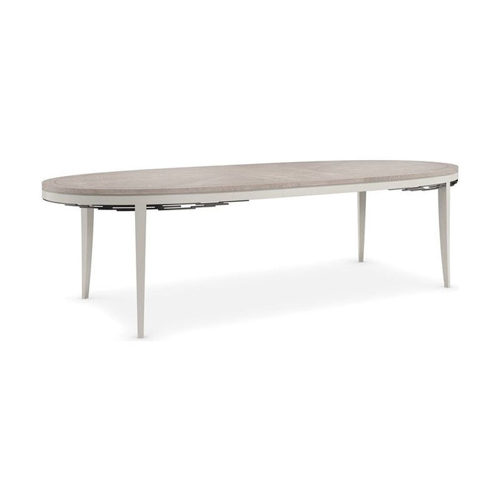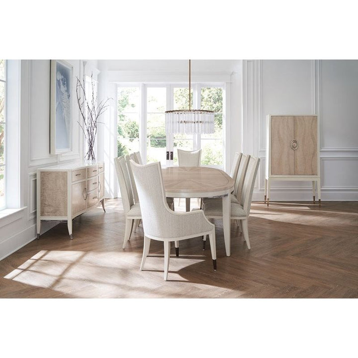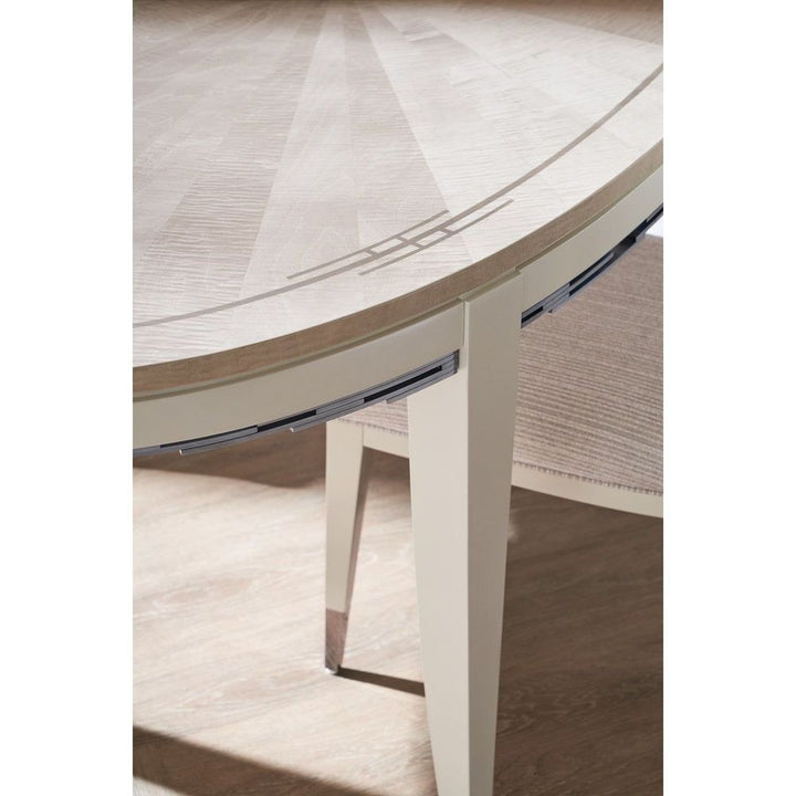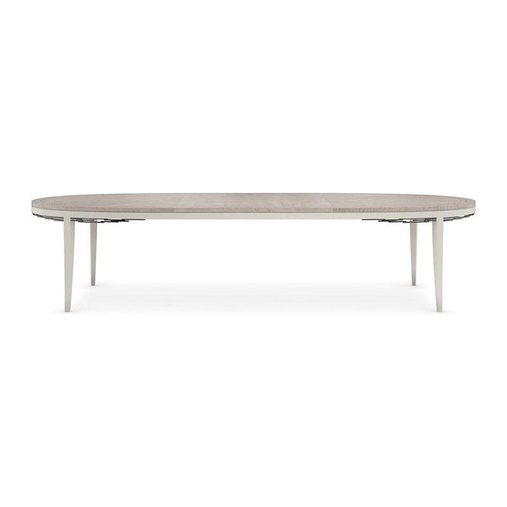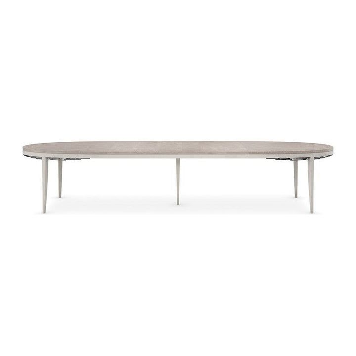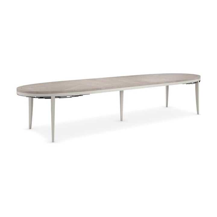 This spacious, oval-shaped dining table makes an elegant statement with a radiating pie veneer pattern on top, intricately crafted from Grey Curly Maple. A neutral Chinchilla finish gives light to flaring wood grains, delicately framed by a silkscreen pinstripe detail in Soft Silver Paint that repeats the decorative metal fretwork beneath the apron. Includes three 22" leaves that allow you to easily extend the table and seat up to 12 guests.