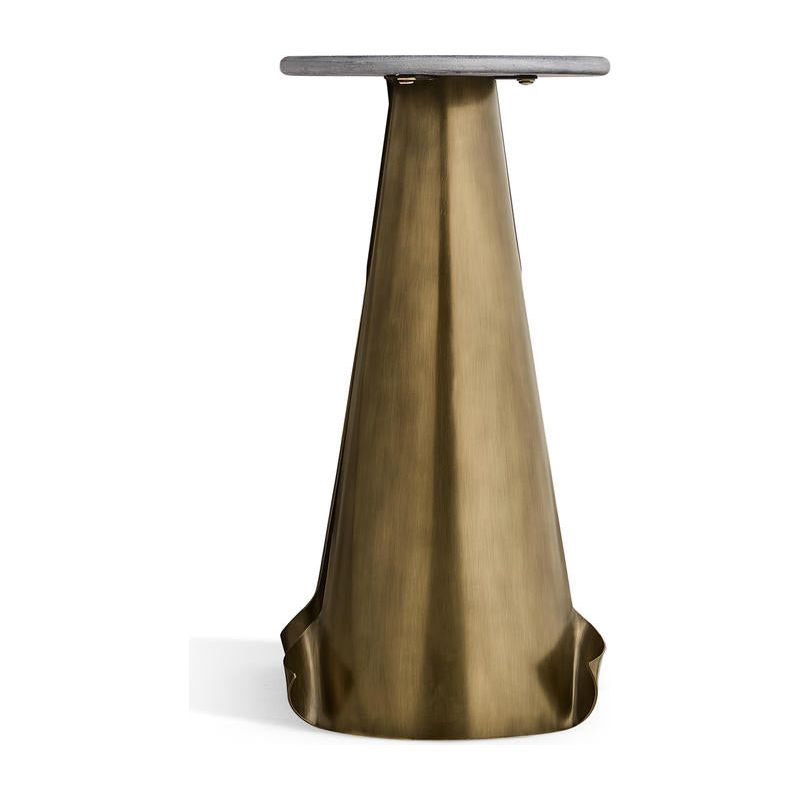 Description: The Hammersmith Drink Table features a bold, sculptural base crafted from bent brass sheet oozing sophistication and artistry. The rich, dark grey stone top offers a striking contrast to the warm metallic tones, creating an eye-catching piece that serves as both functional and decorative.