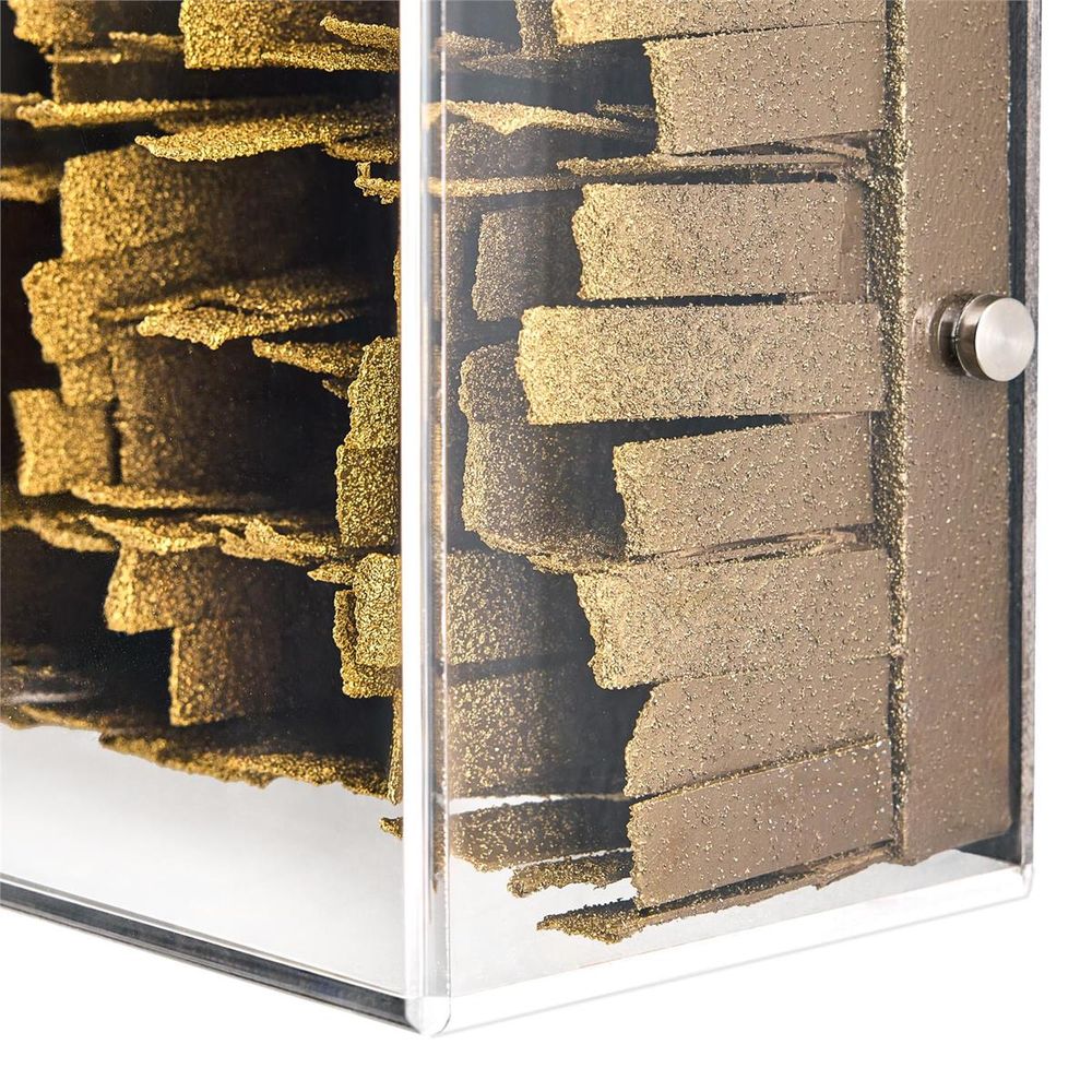 Abstract Geometry, Black by artist Tony Fey is an eye-catching statement piece, introducing any space to a wealth of textural depth. Shown in a sophisticated black tone, the piece showcases a maze-like display of paperboard with rugged edges stretched across canvas. The hand-made piece is held within a clear acrylic box and may only hang in a vertical orientation.