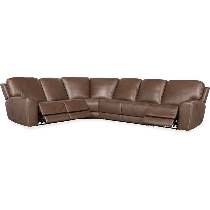 Description: The Torres 6-Piece Sectional with power recline and power headrest offers complete support in style. The sleek silhouette features high backs, topstitch trim and a luxurious semi-aniline top-grain leather in the Sorrento Mocha color. The configuration includes a left armchair, three stationary armless chairs, a corner wedge and right-arm chair, with power recline and power headrests on the left and right chairs. A USB port is also offered.