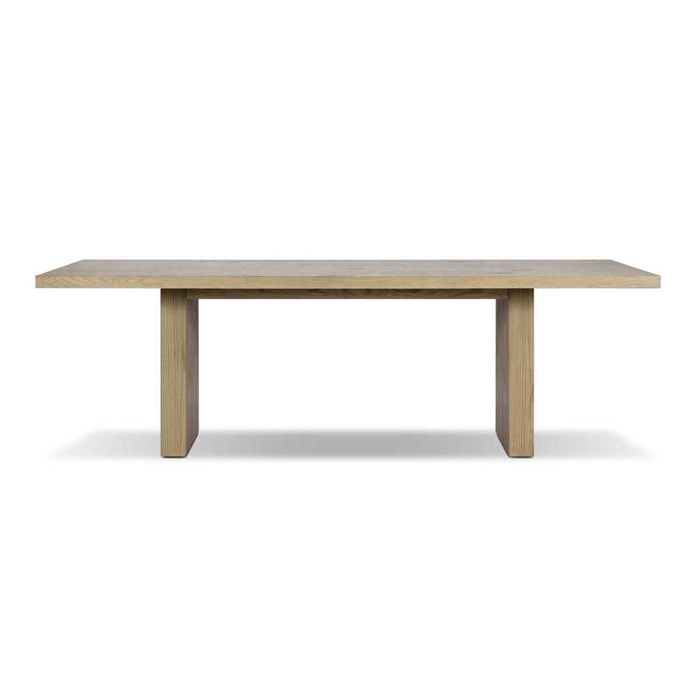 Description: The primitive design of this table pairs a waterfall-inspired leg design with large slabs of resawn umber oak for a piece that is both modern and understated.