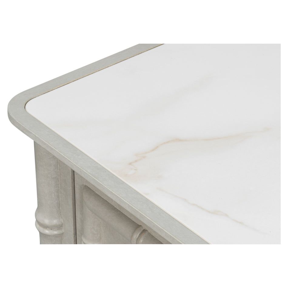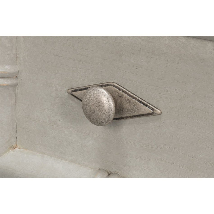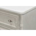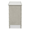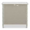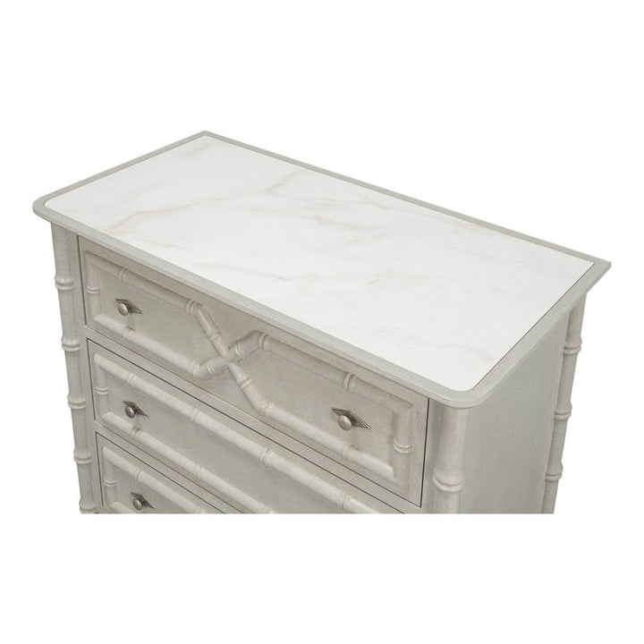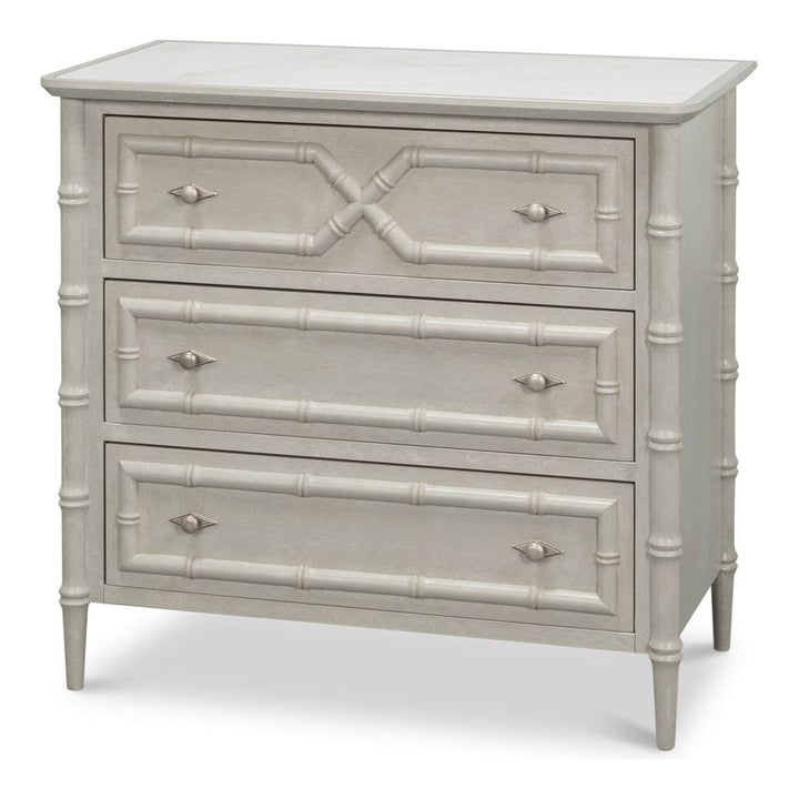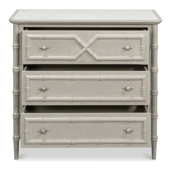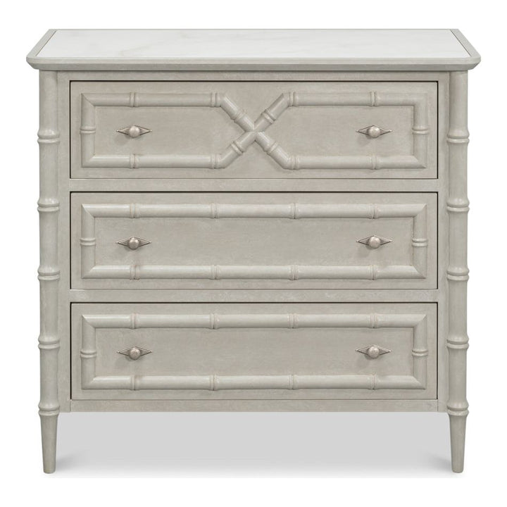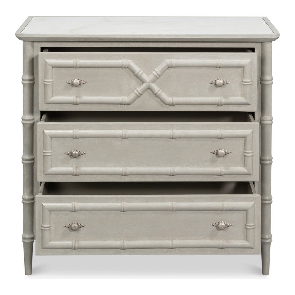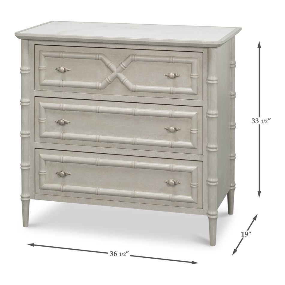 Description: This versatile and sophisticated chest features three spacious drawers, adorned with elegant bamboo accents, offering both style and functionality. The Italian Grigio finish is complemented by the antique pewter hardware. White porcelain tops the Tortola.