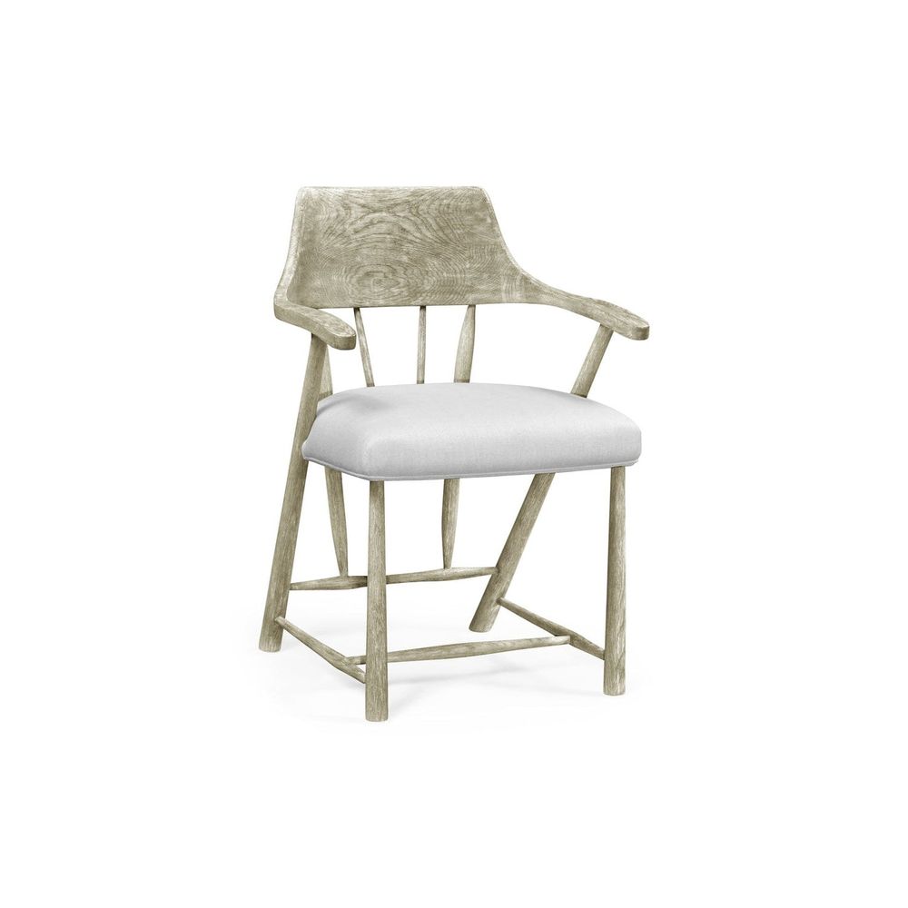 Grey oak dining armchair with a shaped solid plank back supported on spindle uprights two of which join the stretcher beneath for strength. High arms around an upholstered seat in lining and foam only, the back regs rising to form the arm supports.