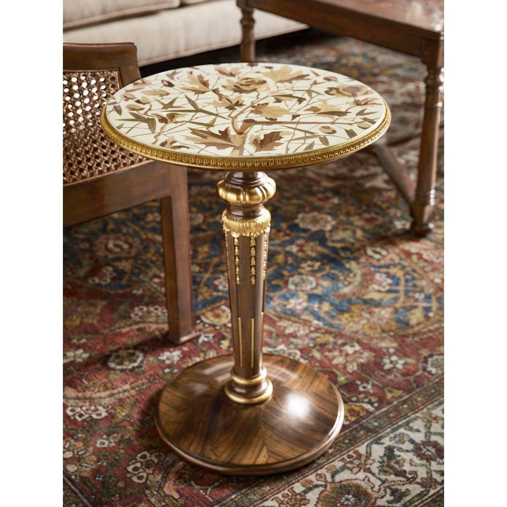 Description: Top features a maple leaf and acorn marquetry pattern.Top showcases a Scagliola technique where the marquetry veneer pieces are filled in with a while lacquer.Gold leaf aplique throughout.Fully tuned pedestal base features detailed carvings