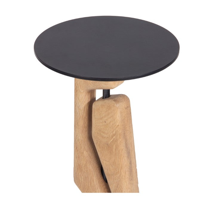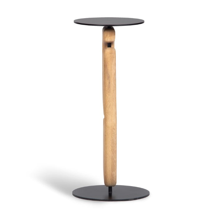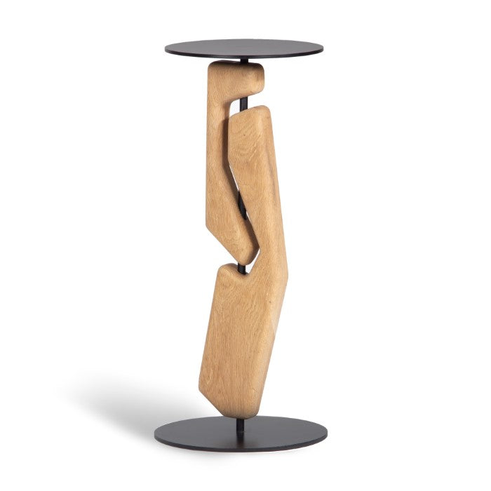 Description: A functional piece of sculpture for your living room. The Tribe Drink Table features 2 solid Oak geometric forms, intersected by a steel upright assembly, finished in a matte black powder coat.