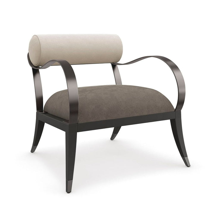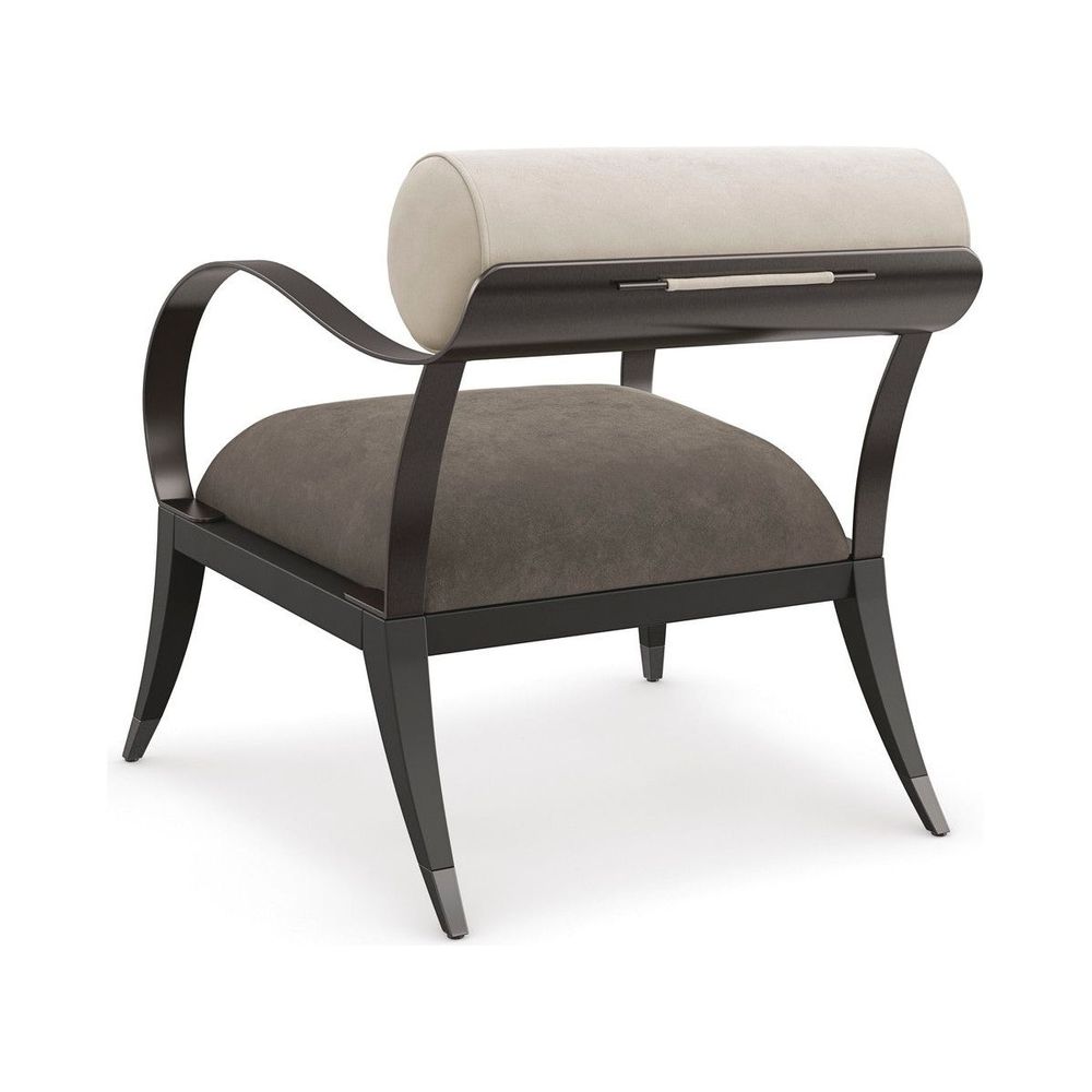 Quintessential, this sculptural chair introduces an airy silhouette, articulated by ribbon metal arms and a floating back and seat. Every detail is intentional, from the slender dowel that neatly secures the bolster pillow, to the outward turning, tapered wood legs capped in Brushed Deep Bronze metal. A plush seat in deep green mohair fabric adds warmth and a luxe note.
