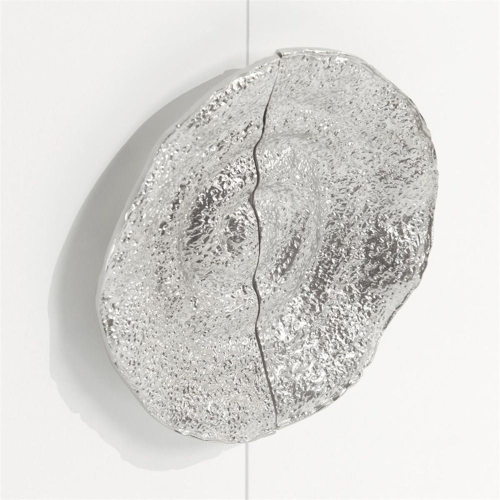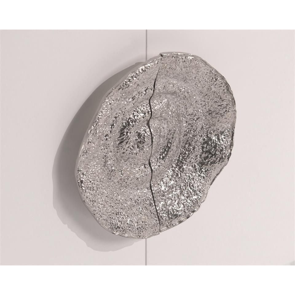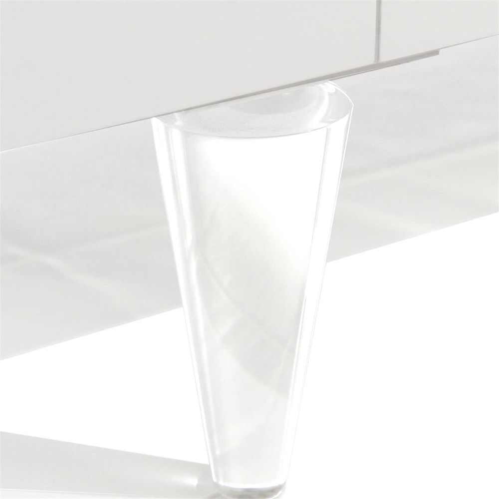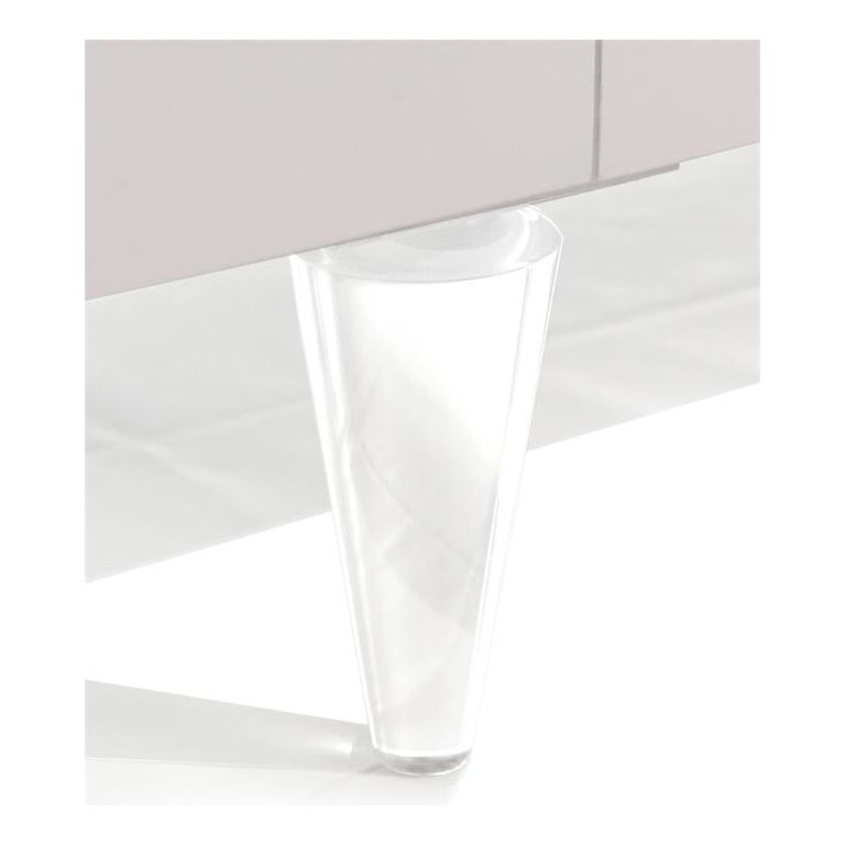 Standing on turned acrylic legs and finished in ice white, this six-door credenza has bold, silvered escargot handles on each pair of doors.