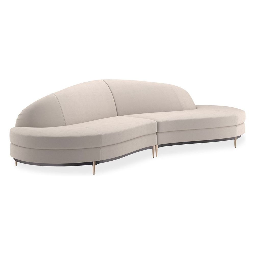 This regal sectional makes a dramatic showpiece that emanates glamour. Upholstered in velvet, its curved profile is complemented by sumptuous comfort. Its lower edge and outer arms are trimmed in Almost Black while its metal tapered feet are finished in Champagne Gold. Artful from edge to edge, this statement piece creates drama wherever it goes.