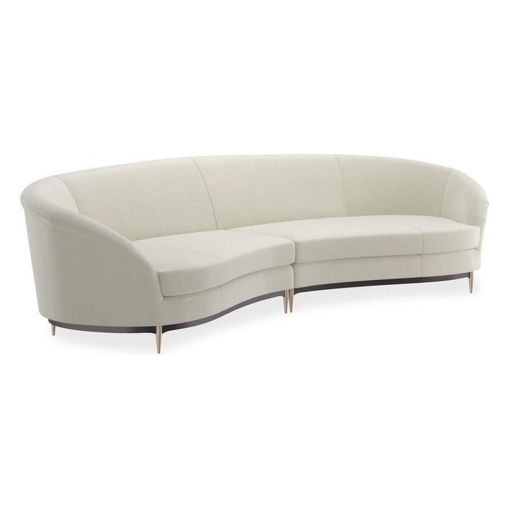 This regal sectional makes a dramatic showpiece that emanates glamour. Upholstered in velvet, its curved profile is complemented by sumptuous comfort. Its lower edge and outer arms are trimmed in Almost Black while its metal tapered feet are finished in Champagne Gold. Artful from edge to edge, this statement piece creates drama wherever it goes.