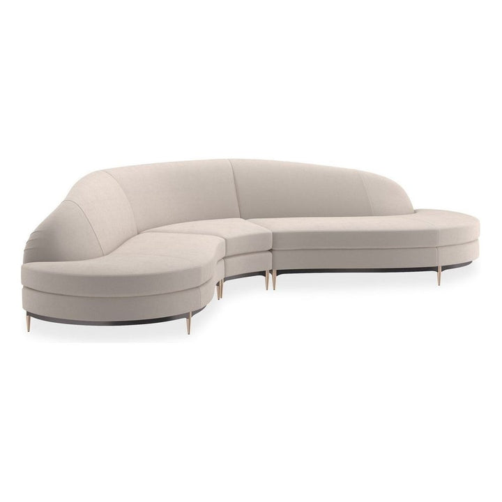 This regal sectional makes a dramatic showpiece that emanates glamour. Upholstered in velvet, its curved profile is complemented by sumptuous comfort. Its lower edge and outer arms are trimmed in Almost Black while its metal tapered feet are finished in Champagne Gold. Artful from edge to edge, this statement piece creates drama wherever it goes.