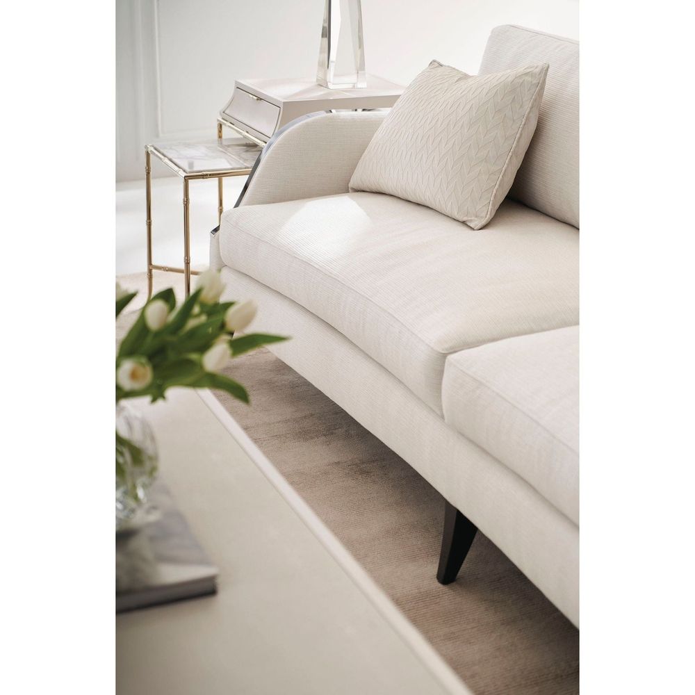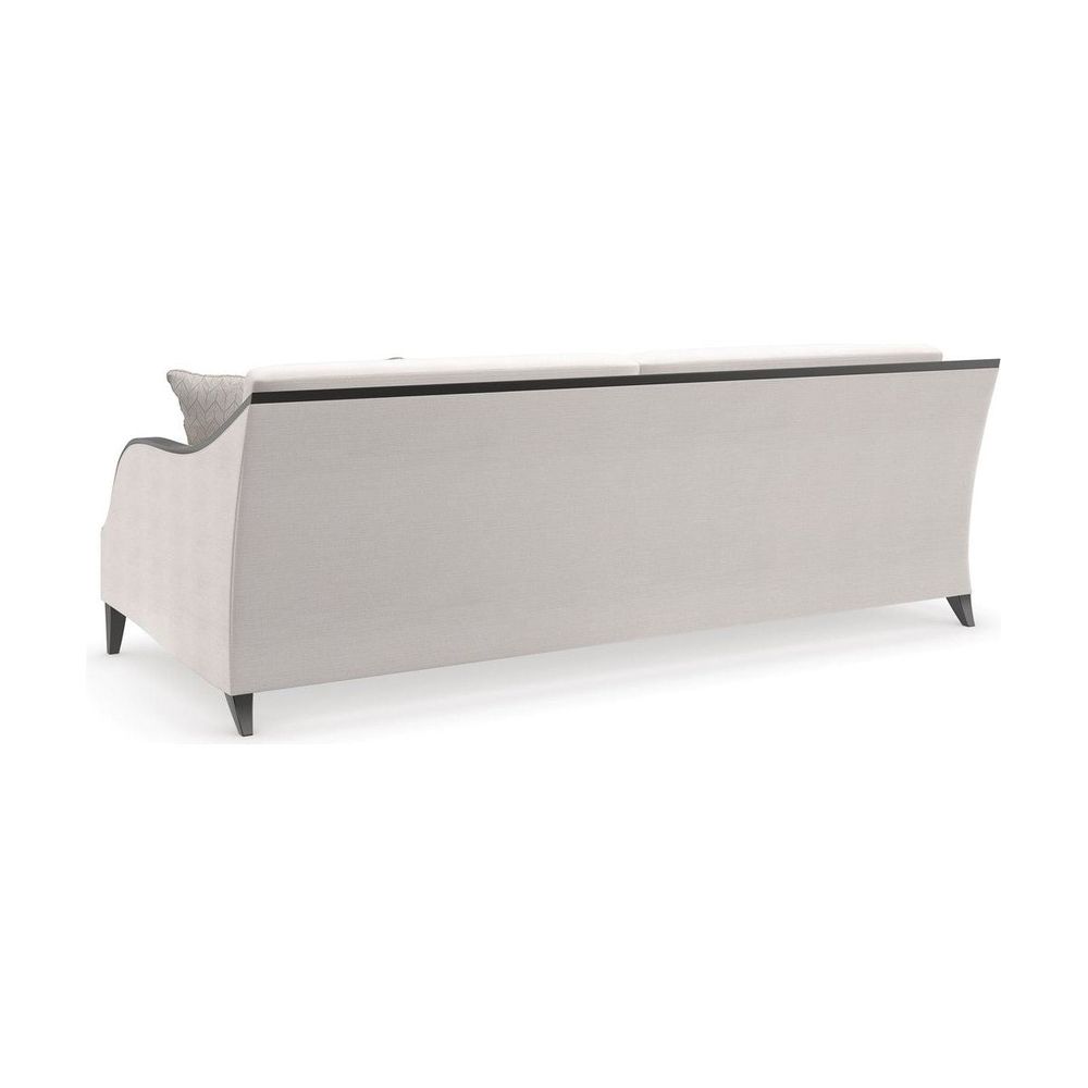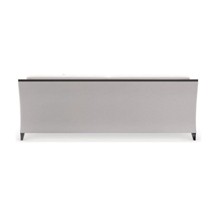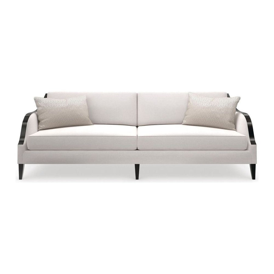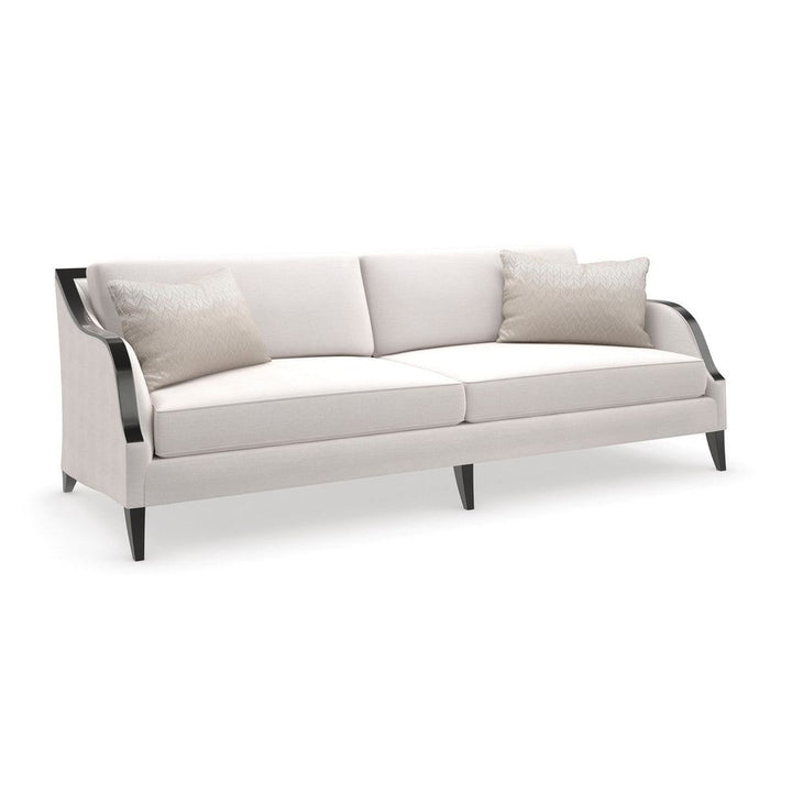 This sleek track arm sofa is elegantly defined by an exposed wood frame in a richly contrasting, Chocolate Truffle finish. Finely tailored in a cream basketweave and accented with kidney back pillows for added comfort. Toss pillows in an exaggerated herringbone pattern tie together this modern-meets-traditional, iconic aesthetic. Matching chair also available.