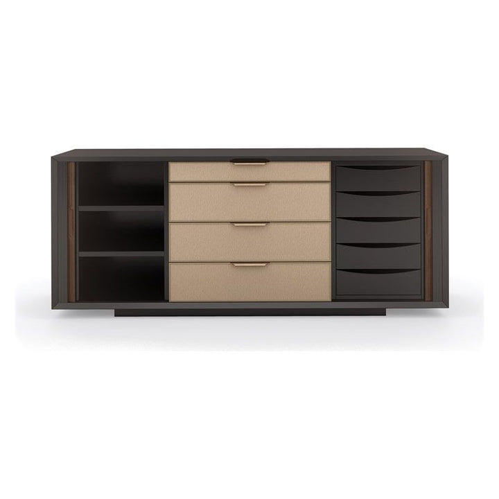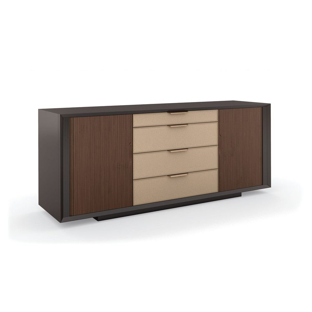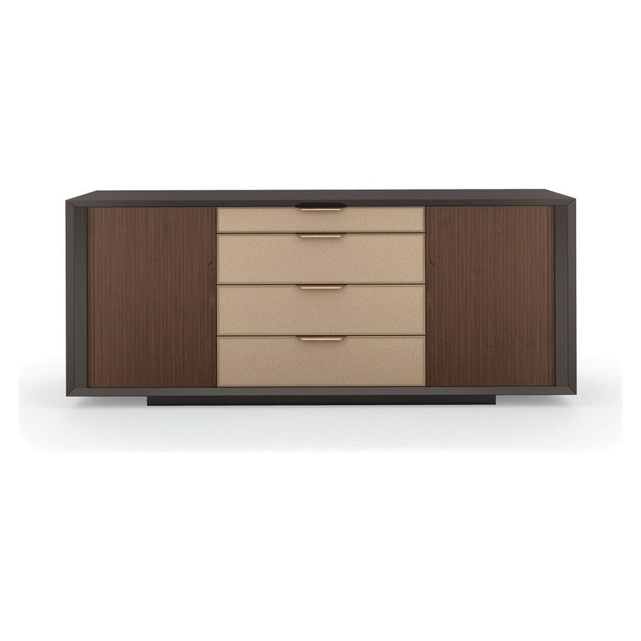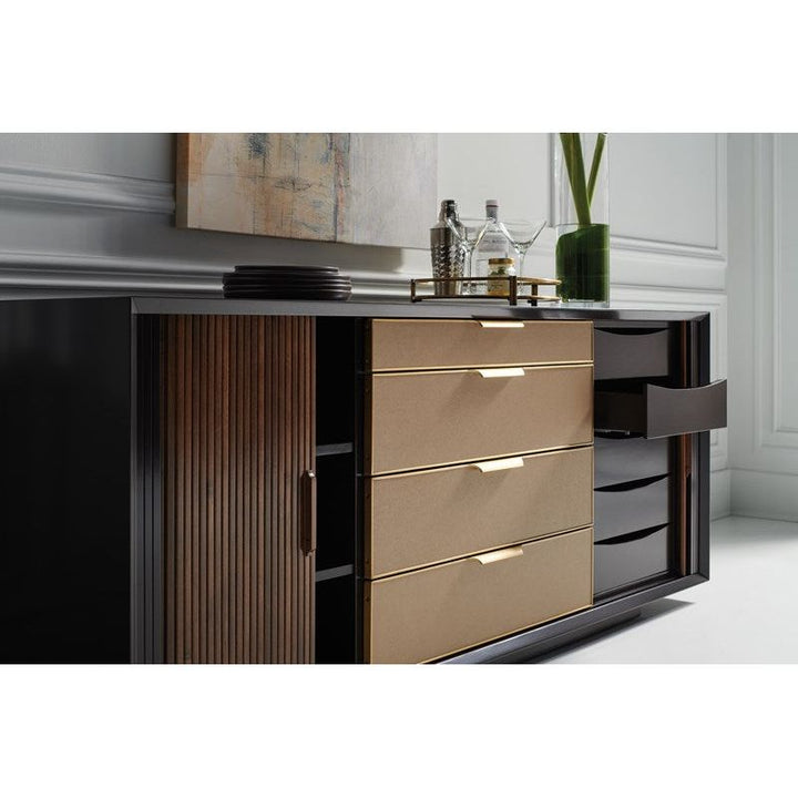 A masterful mix of form and function, this mid-century-inspired console stirs interest with its linear design and host of storage options. Sliding tambour doors in Rich Walnut add texture and contrast to a Dark Chocolate finish. Framed in Champagne Gold, four center drawers feature vinyl fronts, embossed with a pattern reminiscent of rain trickling down a windowpane. Expansive storage offers two fixed shelves on the left, offset by five soft close drawers on the right. Modern and multifunctional, its clean-lined design is well-suited for living, dining, and bedroom interiors.