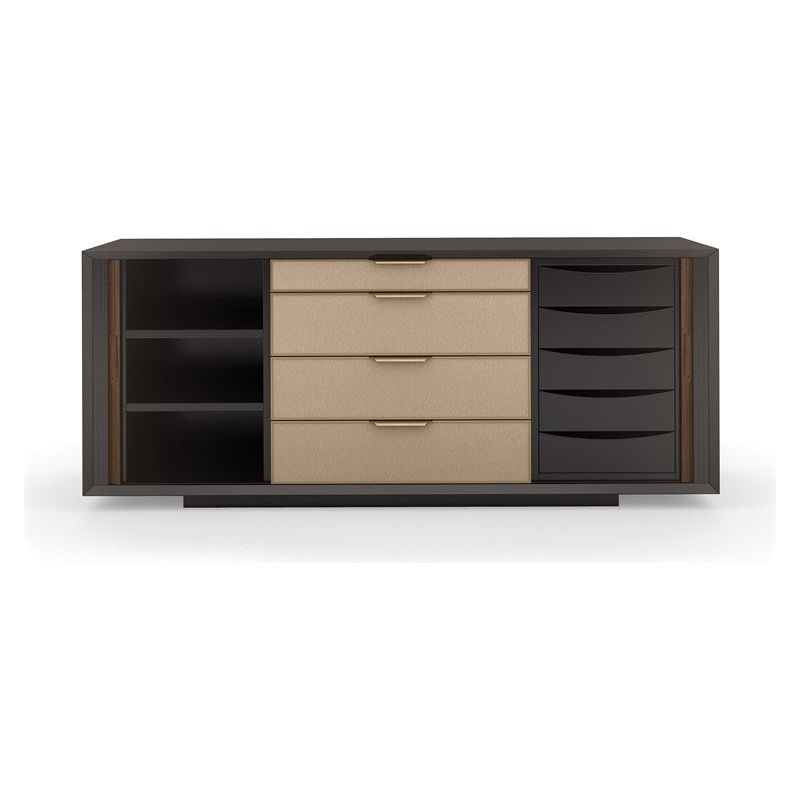 Features: Top, ends and face of frame in Dark Chocolate.Metal trim in Champagne Gold.Tambour doors on each end in Rich Walnut with two fixed shelves on left side and five undermount soft close drawers on right side.Four center drawers with vinyl fronts and soft close undermount guides. Top drawer with felt lined bottom.Interior in Dark Chocolate.Plinth base in Dark Chocolate.