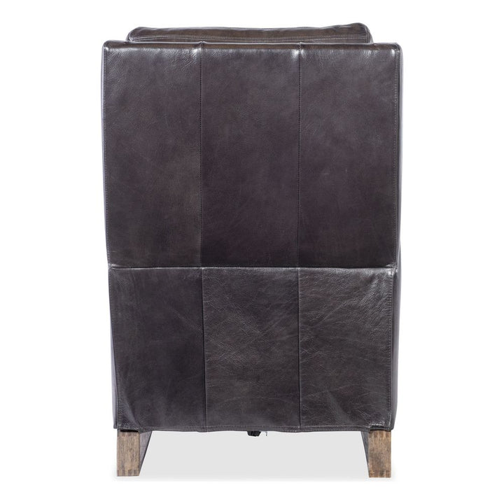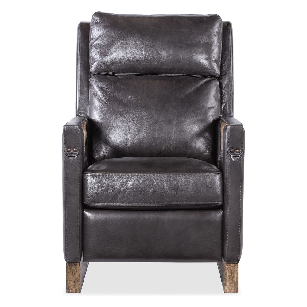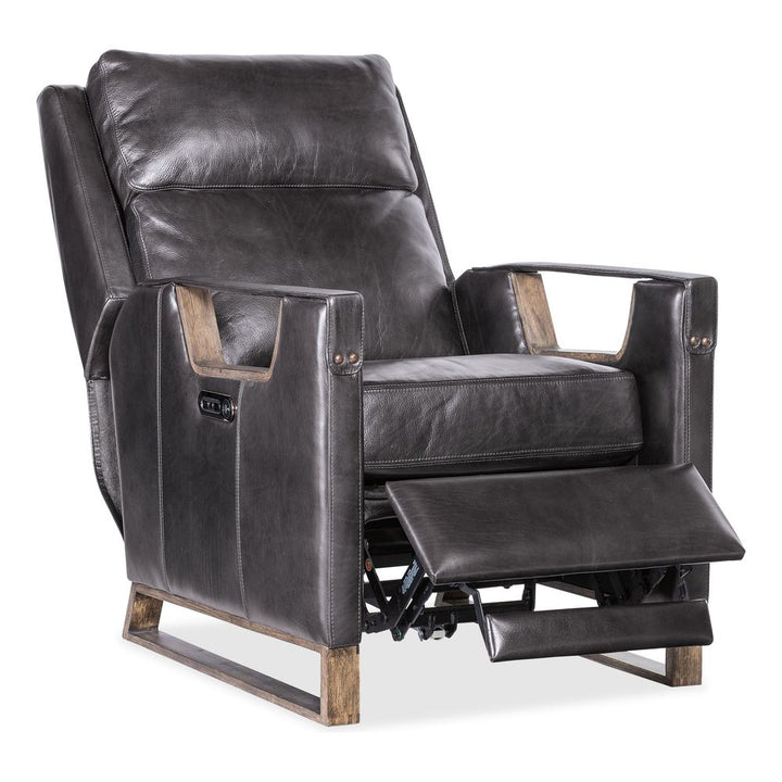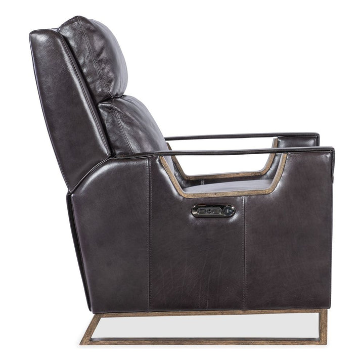 Description: Discover unparalleled comfort and sophistication with the Graphite leather Twilight Power Recliner. Designed for the modern home, this recliner offers a power headrest and USB port, blending functionality with contemporary style. Its light wood finish and button accents on the arm add a touch of elegance. Elevate your living room with this statement piece from FAS Traditions Upholstery.