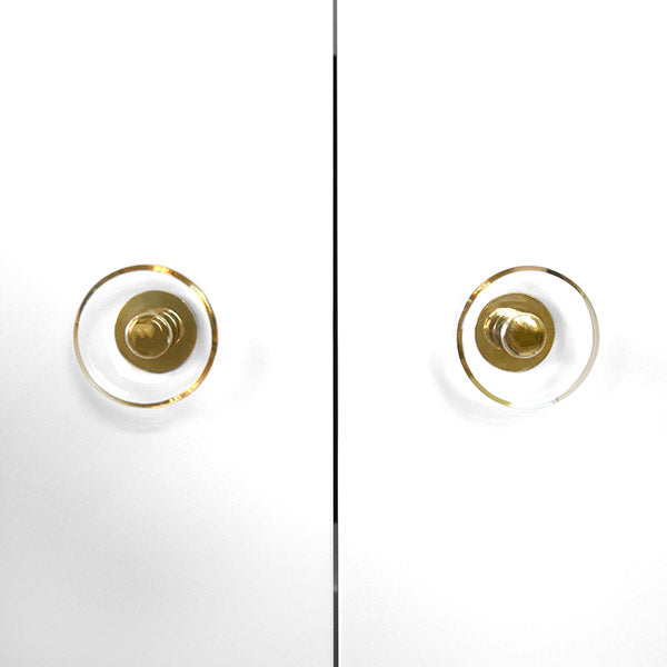 Description: Create the perfect storage display or send your kids off to college in style with our two-door Judd matte white lacquer storage cabinet. Store your mini refrigerator on one side with ample shelving space on the other. Crystal clear lucite and brass knobs complete the elegant look. Right Side Cabinet Interior Dimensions: 44" H x 28" W x 22" D