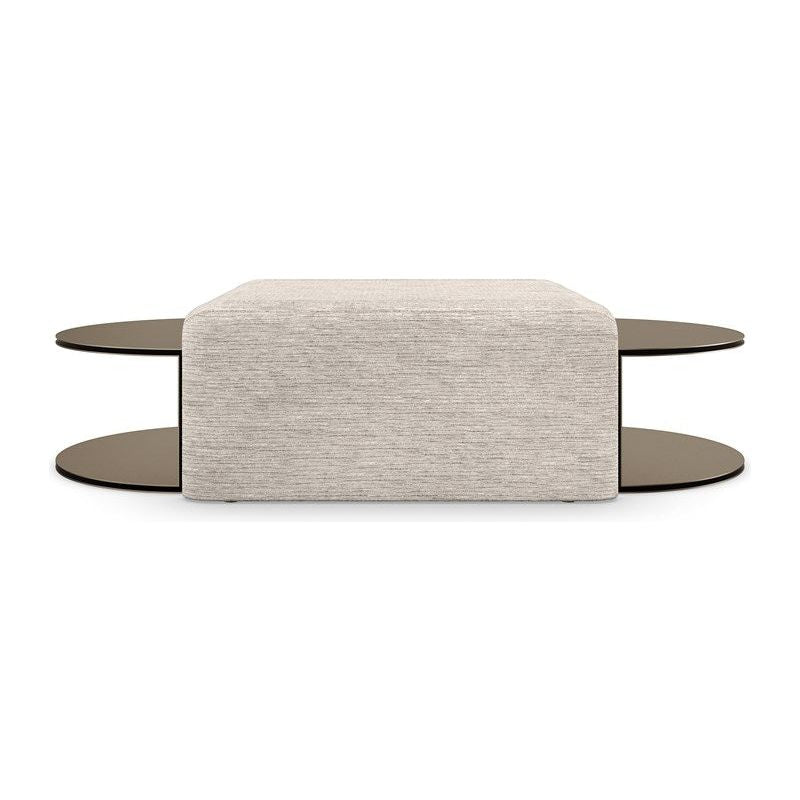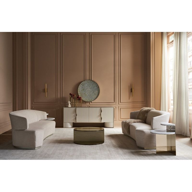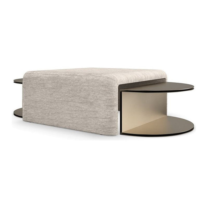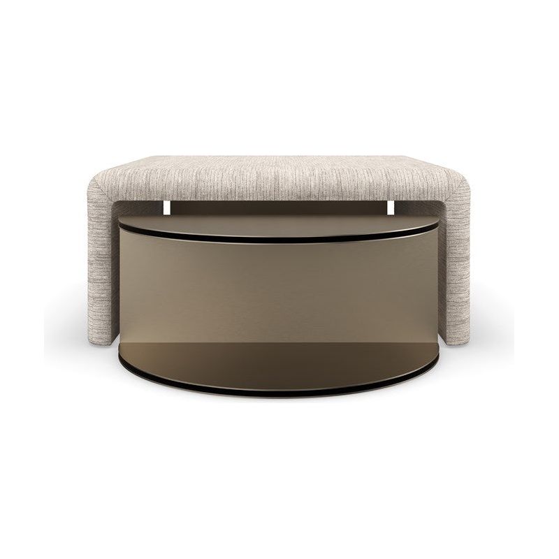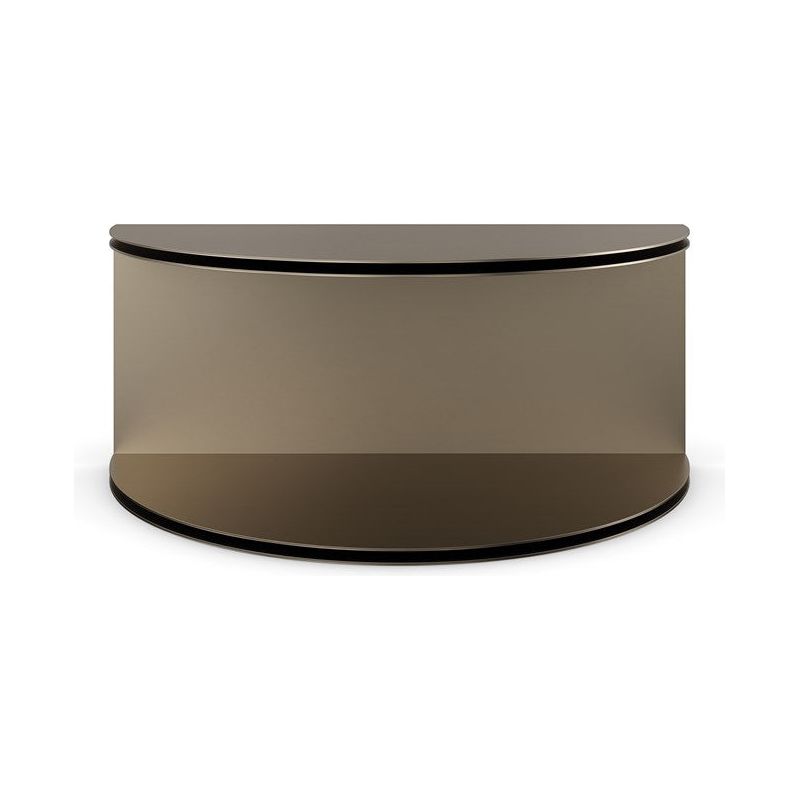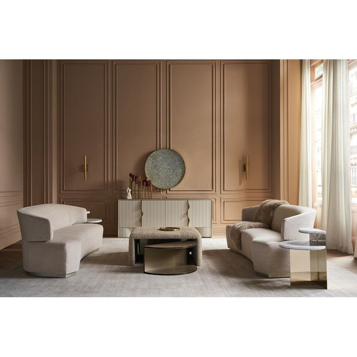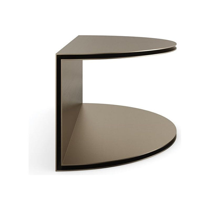 The elegance of geometry was inspiration for this dually functional table, composed of two demilune shapes that come together and form a perfect circle. Introduces an industrial yet luxurious aesthetic in a Champagne Gold finish, designed with a double wall of bent metal to create a cantilevered upper and lower shelf. Tuck beneath our Bridge the Gap table for a unique cocktail table that melds sleek metallic curves with a tactile form in a soft rib cloth fabric with a blush gold tone. Or, pull apart to style as individual end tables.