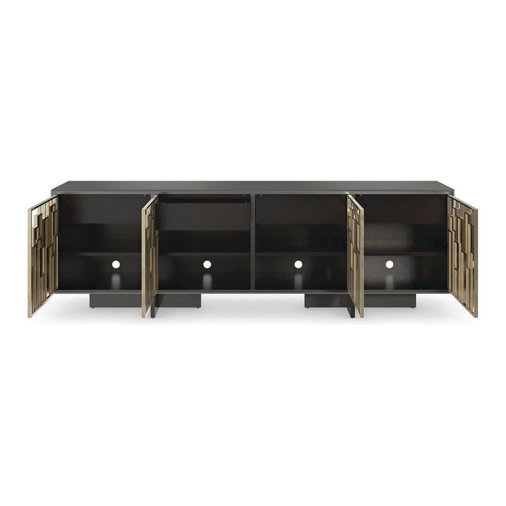 With an air of sophistication and modern luxury, this console calls to mind a dazzling city skyline at night. Uniquely crafted, its four doors feature inset panels with layered geometric shapes in a glimmering mix of metal finishes. Offers streamlined, tucked-away storage with four drawers and an adjustable shelf below. Cutouts in the back panel allow for wire management. Makes an unforgettable statement in hallways, living and media rooms.