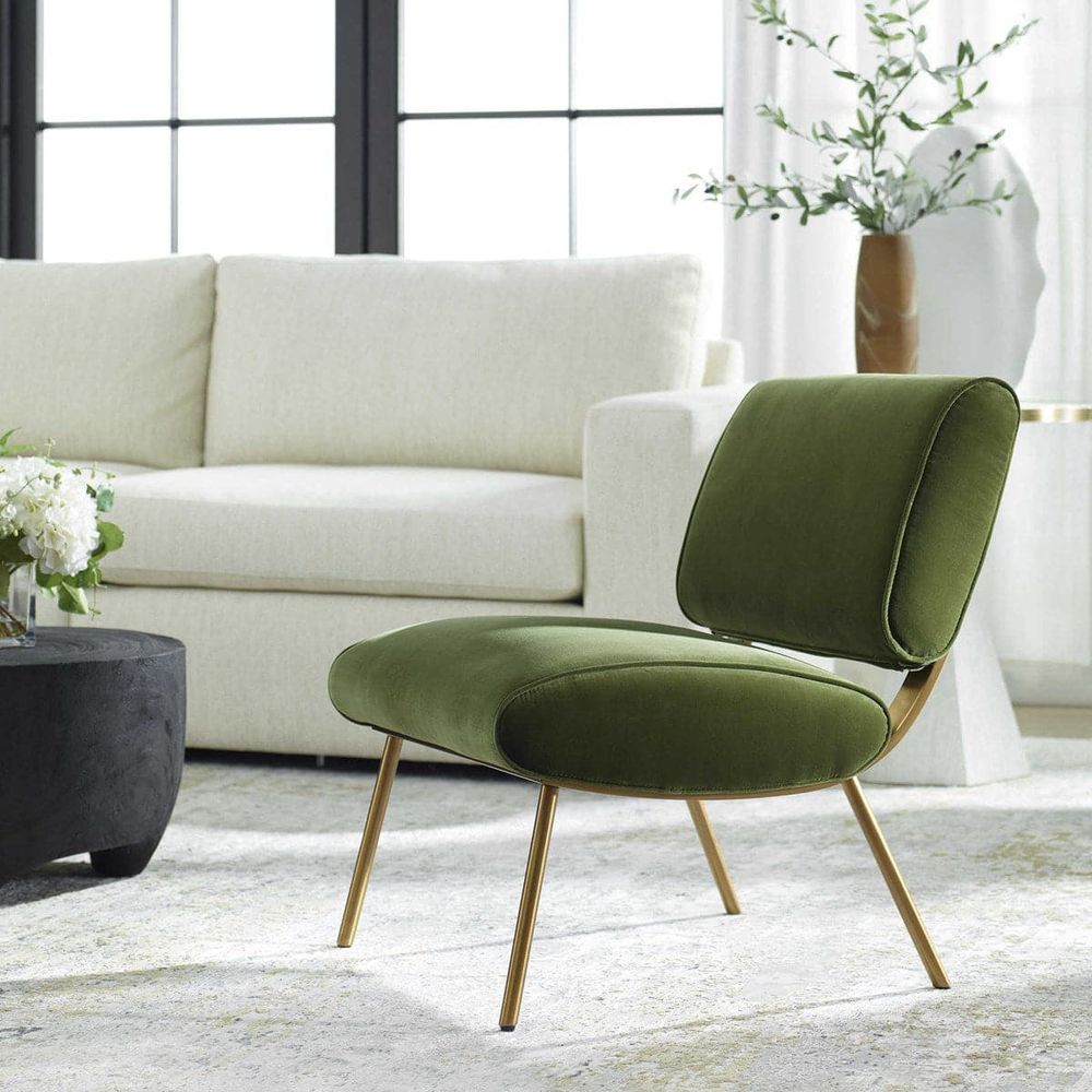 Bold mid-century style is elevated with the dramatic back of the Knoll Accent Chair. Crafted from stainless steel in brushed brass with button accents. Upholstered in a smooth olive green polyester velvet. Seat height is 18".