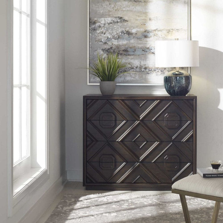 With a transitional deep walnut finish over mindi veneer, naturally distressed and hand rubbed to expose natural undertones, this four drawer chest features an updated geometric carved molding front over a floating plinth base.