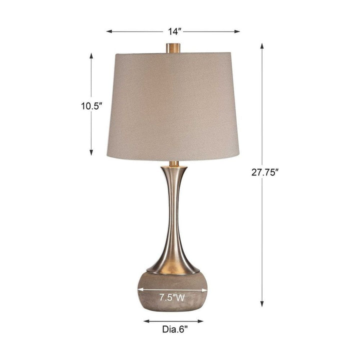 This sleek spun metal base features a plated brushed nickel finish, displayed on a smoothed natural concrete foot. The tapered round hardback shade is a light gray, coarse weave linen fabric.