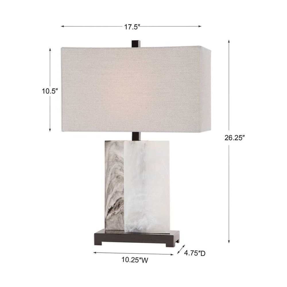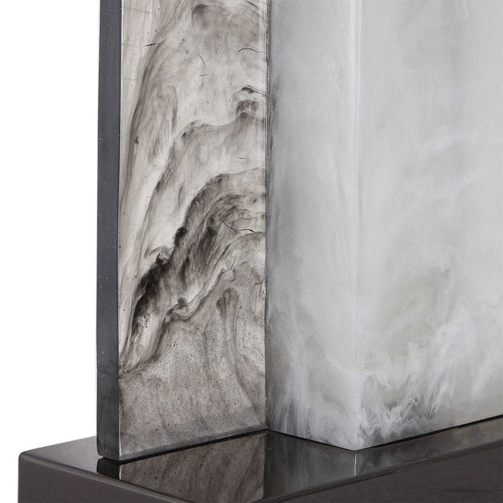This modern silhouette features two rectangular slabs reminiscent of billowing smoke fastened in an off-set construction accented with polished black nickel plated details. The rectangle hardback shade is an off-white and gray linen fabric with natural slubbing.