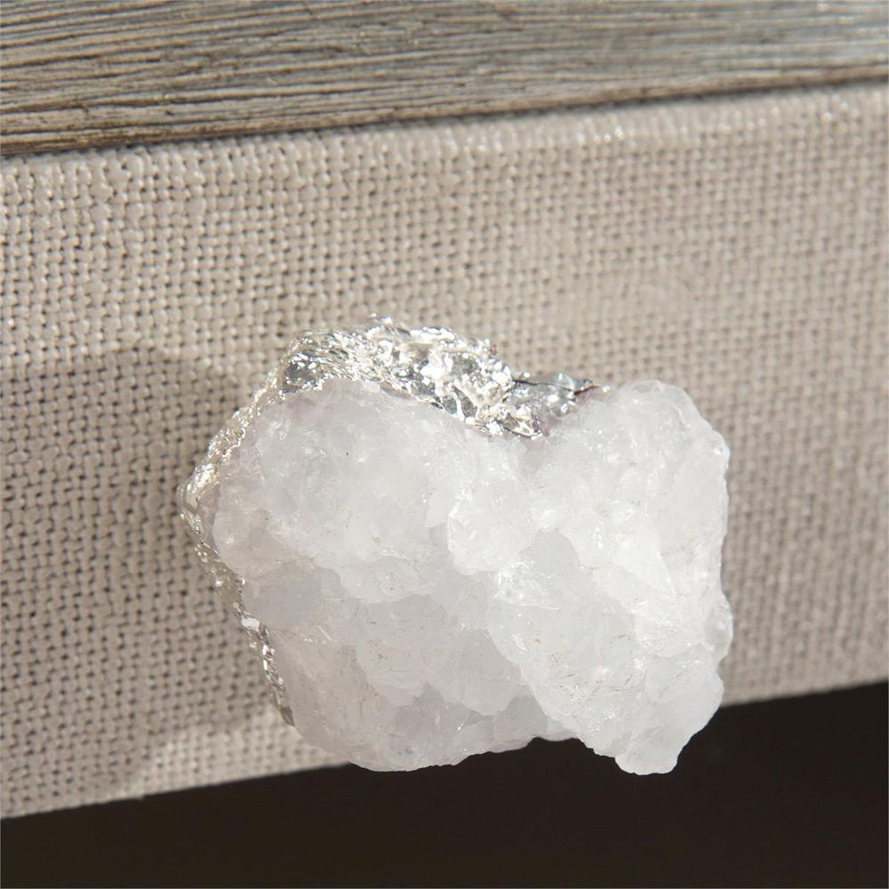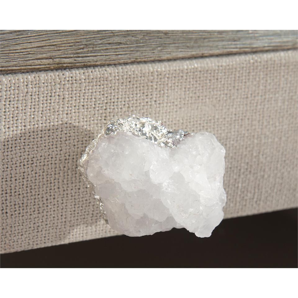 Description: The Valeria Nightstand features a single drawer, storage space, and a pullout slide. The case is inlaid with white linen panels and silver white moldings. The drawer and slide are ornamented with crystal pulls. The interior is finished in antique beluga.