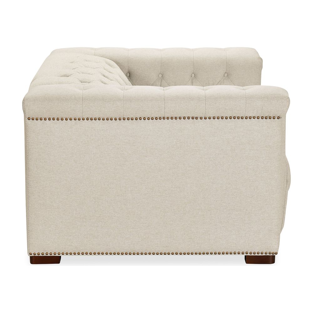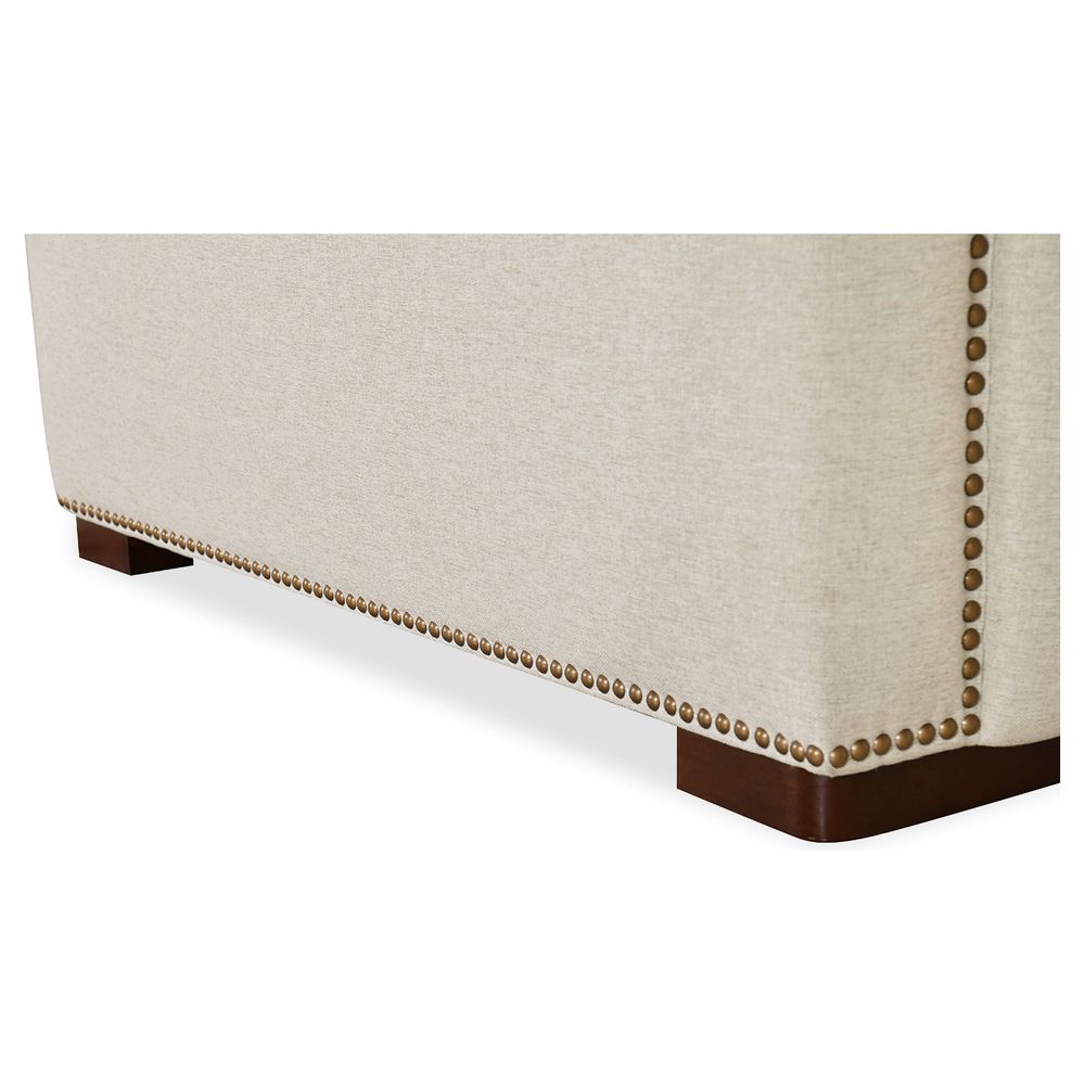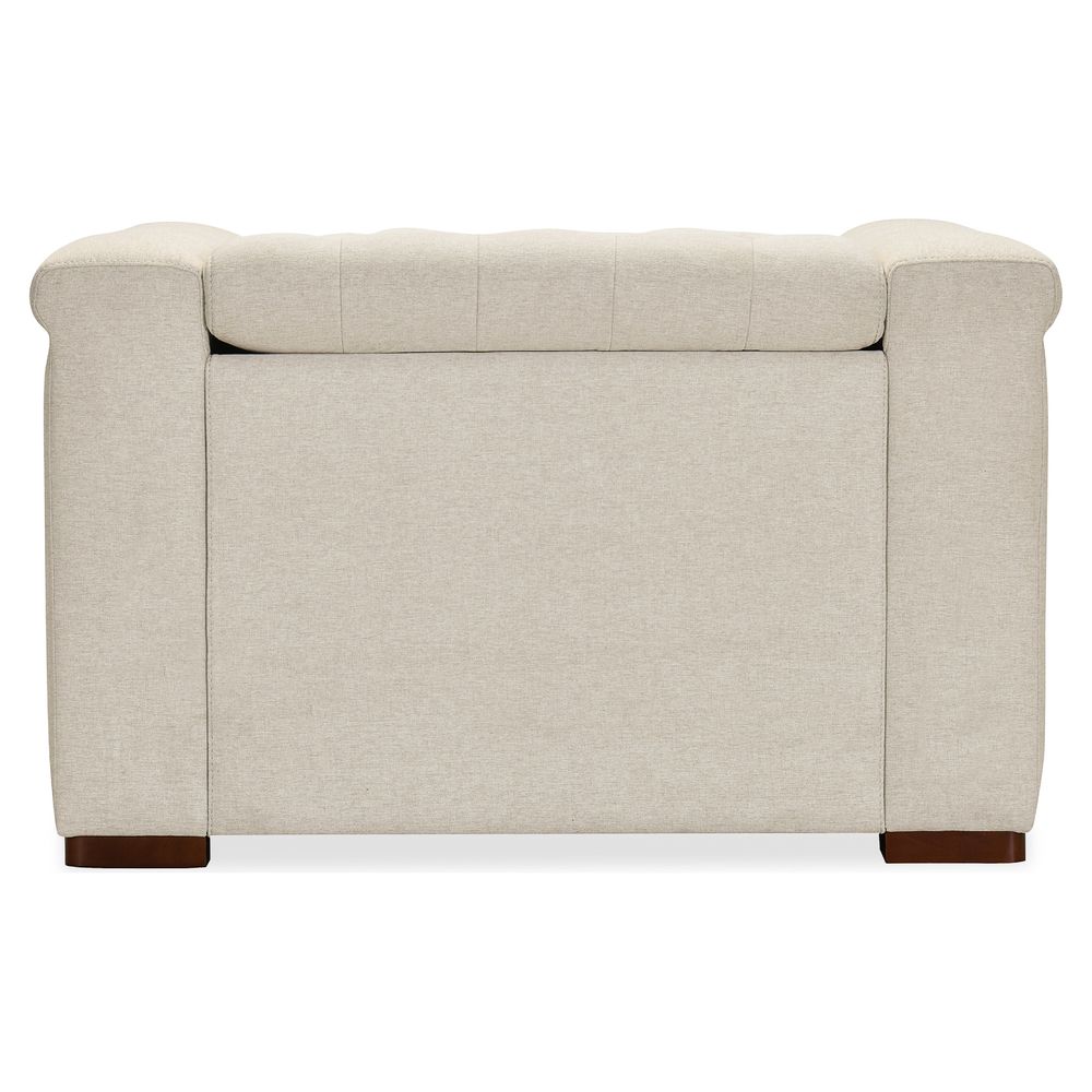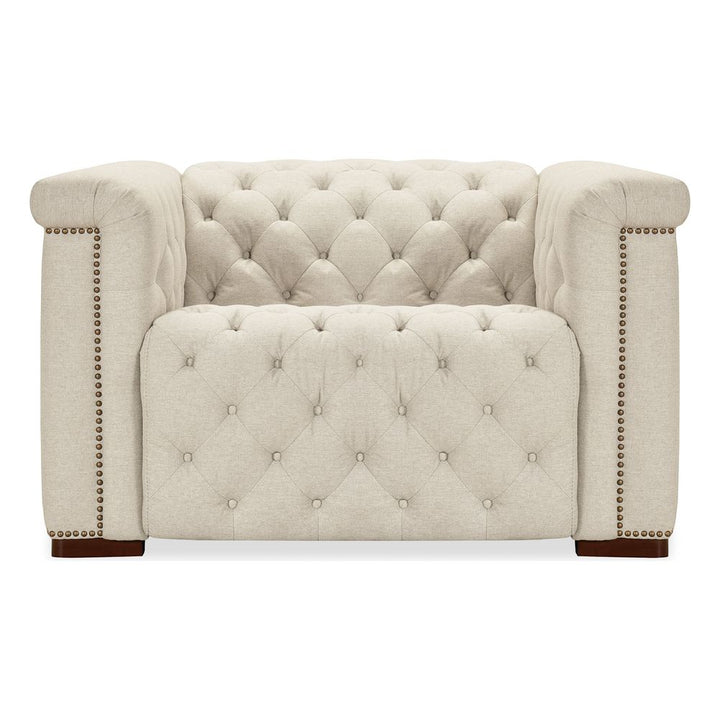 Description: The Vanguard Deux Power Recliner offers a blend of sophistication and comfort, featuring a power headrest and power reclining mechanism. Upholstered in Aries Beach performance fabric, it showcases chesterfield tufting with copper-toned nail trim and a dark wood finish. The fabric provides a soft yet strong texture. With high-density foam cushions and a discreet reclining function, this recliner delivers an effortless balance of style and relaxation.