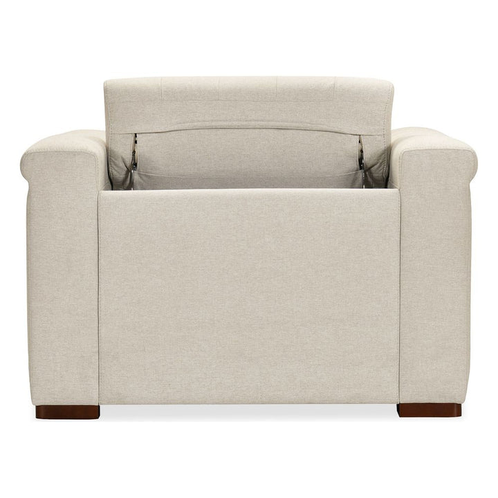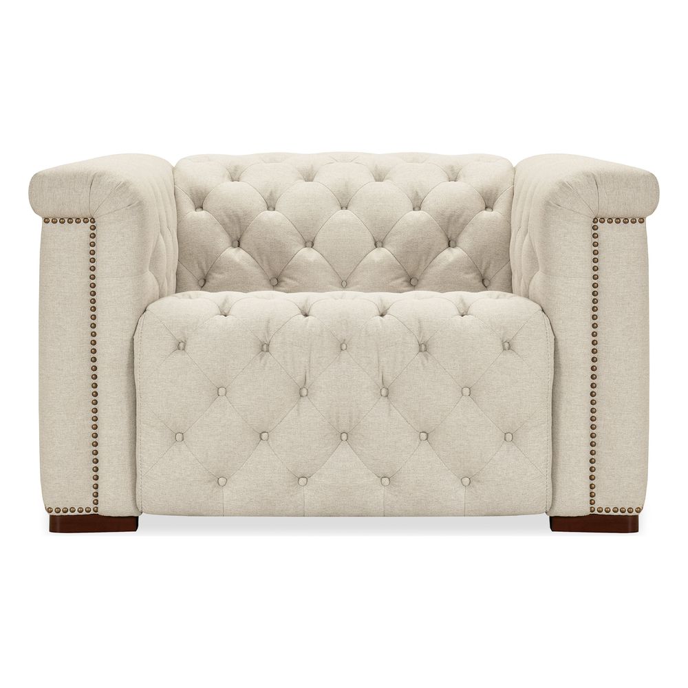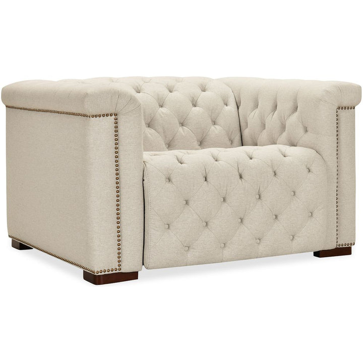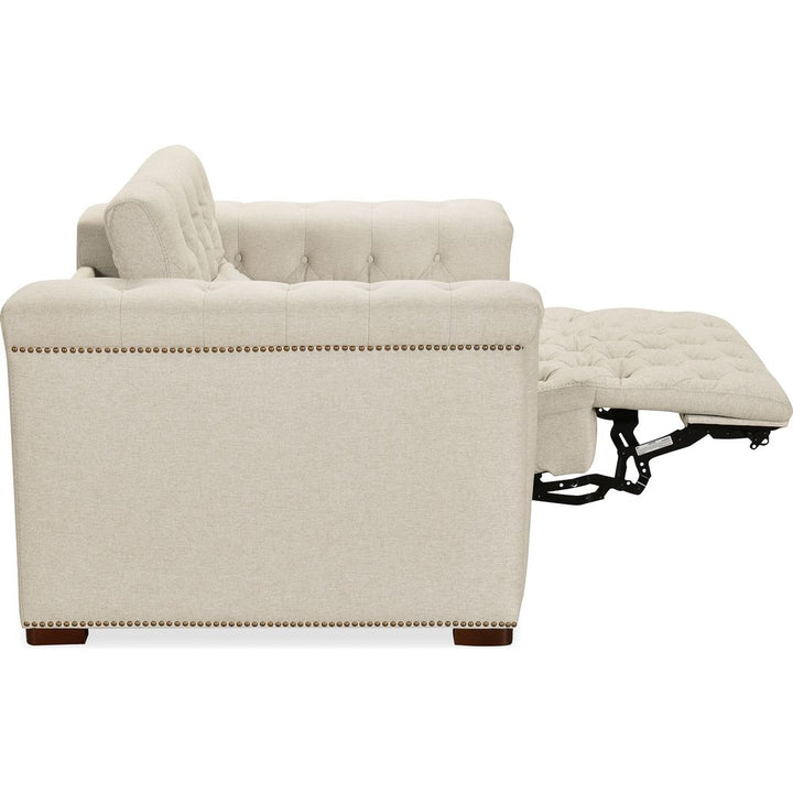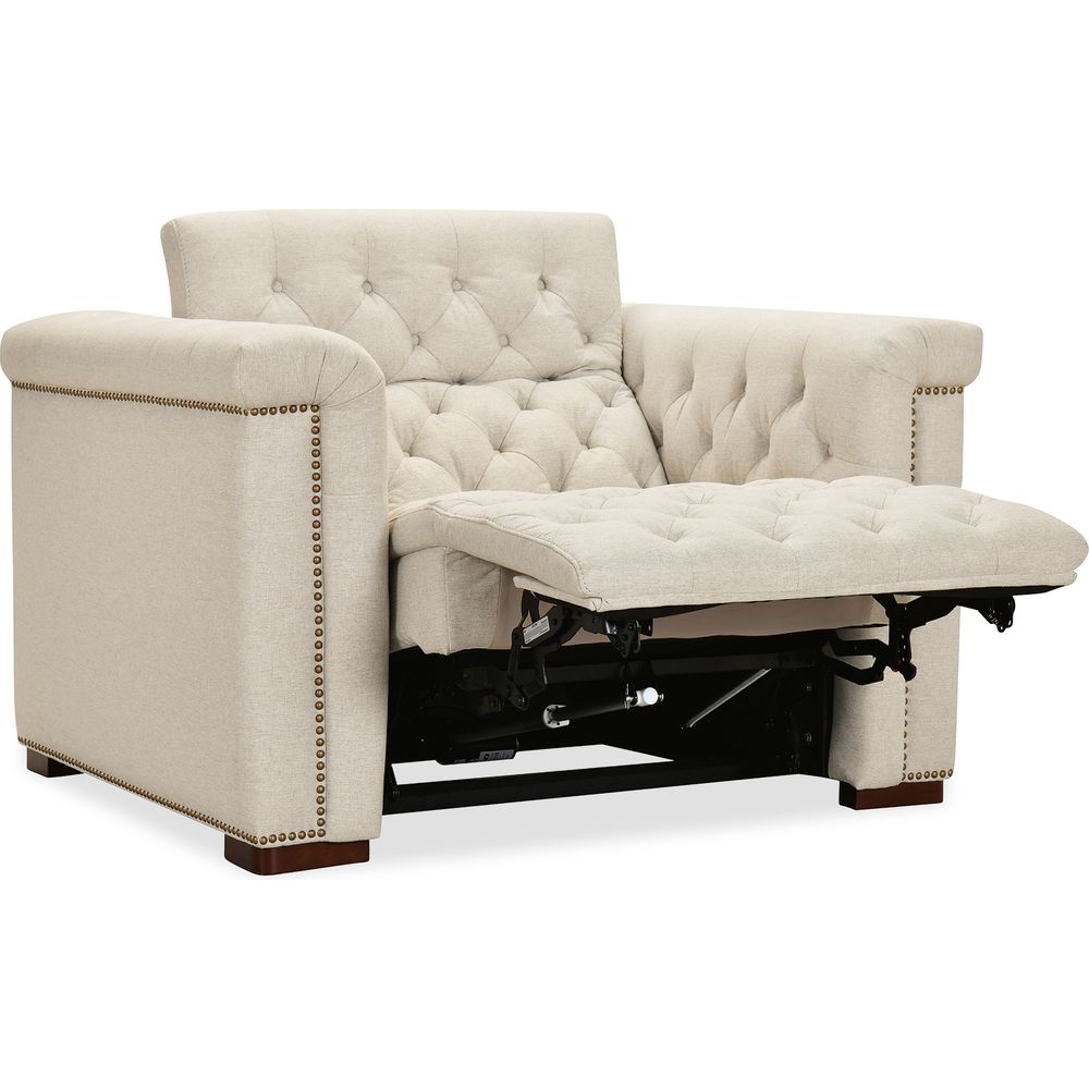 Features: Power recline; Power headrest; Seamless blend of sophistication and versatility; Classic chesterfield tufting with copper toned accent nail trim; Patented design with a timeless allure; Discreetly concealed synchronized power recline function; Fabric is a smooth tabby weave which is crafted from variegated sand colored polyester yarns with a performance finish