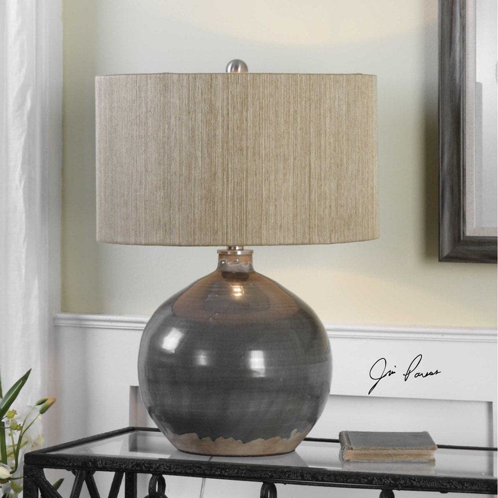Heavily Crackled Charcoal Gray Ceramic Glaze With A Rust Brown Undertone Accented With Plated Brushed Nickel Metal Details. The Round Hardback Drum Shade Is A Textured Woven Rattan. Due To The Nature Of Fired Glazes On Ceramic Lamps, Finishes Will Vary Slightly.