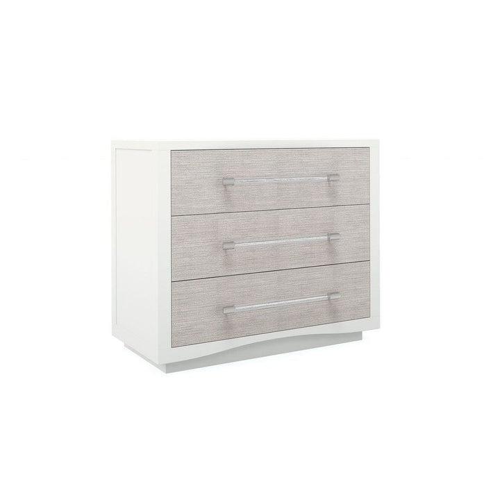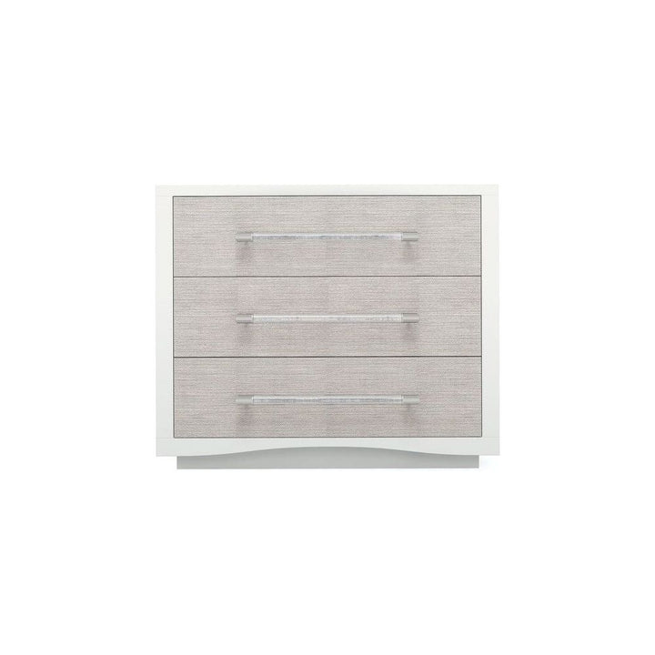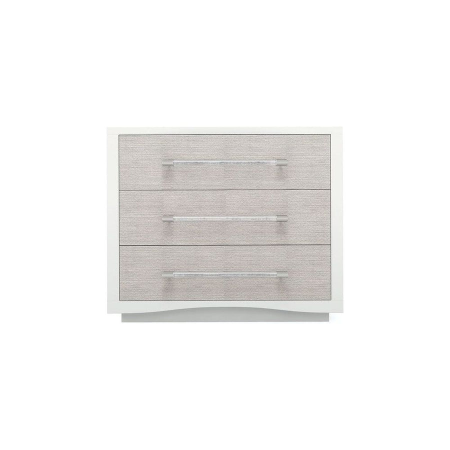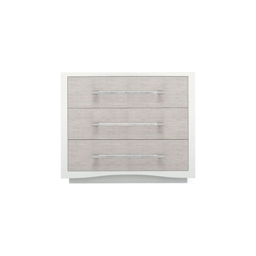 Features: Case finished in Pearly White Textured.Three drawers with raffia wrapped fronts in Sun-kissed Silver and undermount soft close guides.Drawer interior in Pearly White Smooth.Hardware in Satin Nickel with acrylic pull rod.