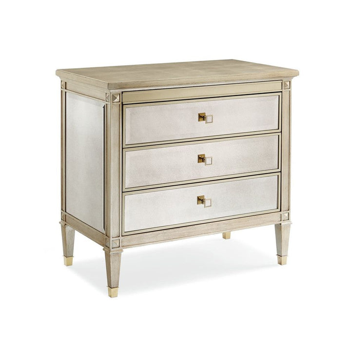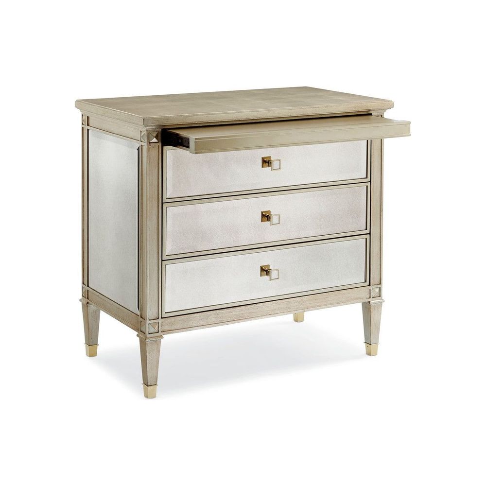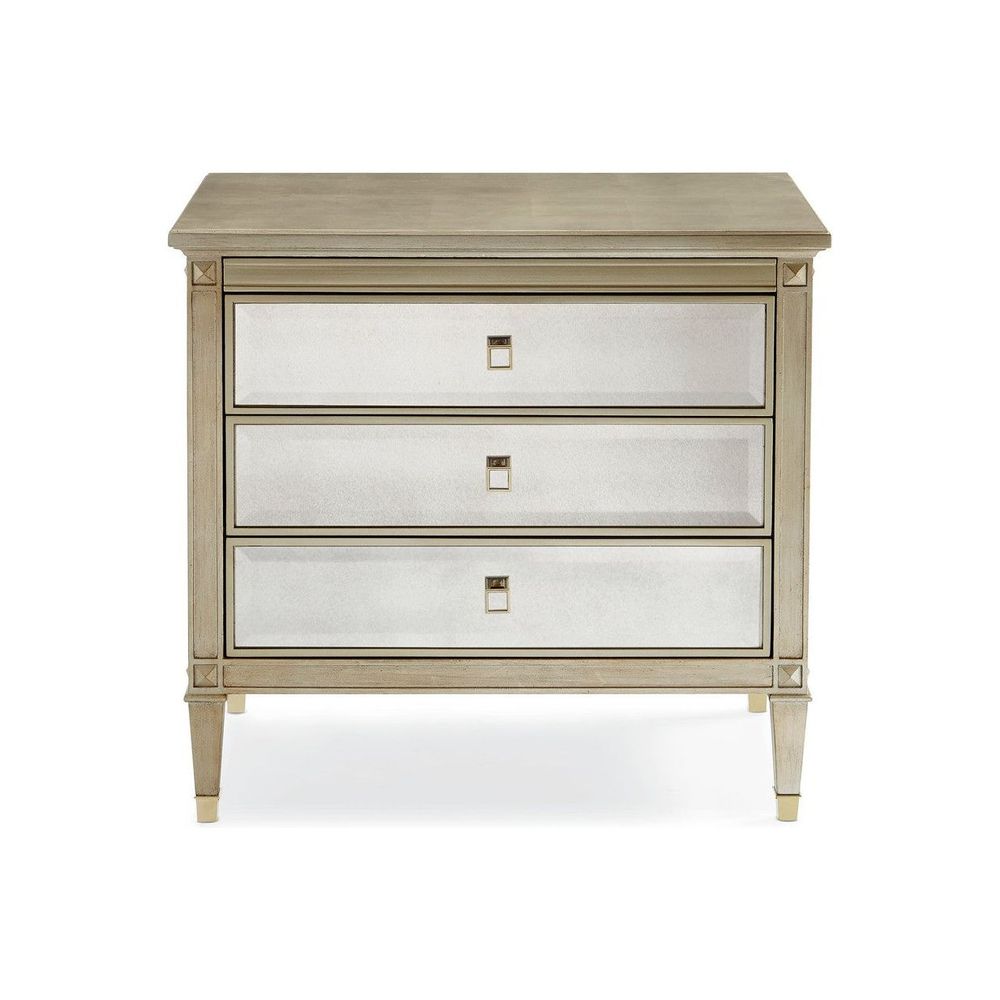 This nightstand is a beautiful reflection on your style. The case exemplifies a modern interpretation of linear Italian design with the addition of a lustrous Auric silver leaf finish and beveled antique mirror facades. This carved chest features three soft-close drawers with custom-designed square metal/mirrored pulls. The interior is finished in sparkling Gold Bullion Paint. Beautifully carved square tapered feet with metal ferrules make this a regal piece to stand beside a luxurious bed.