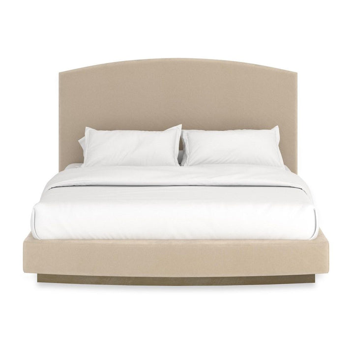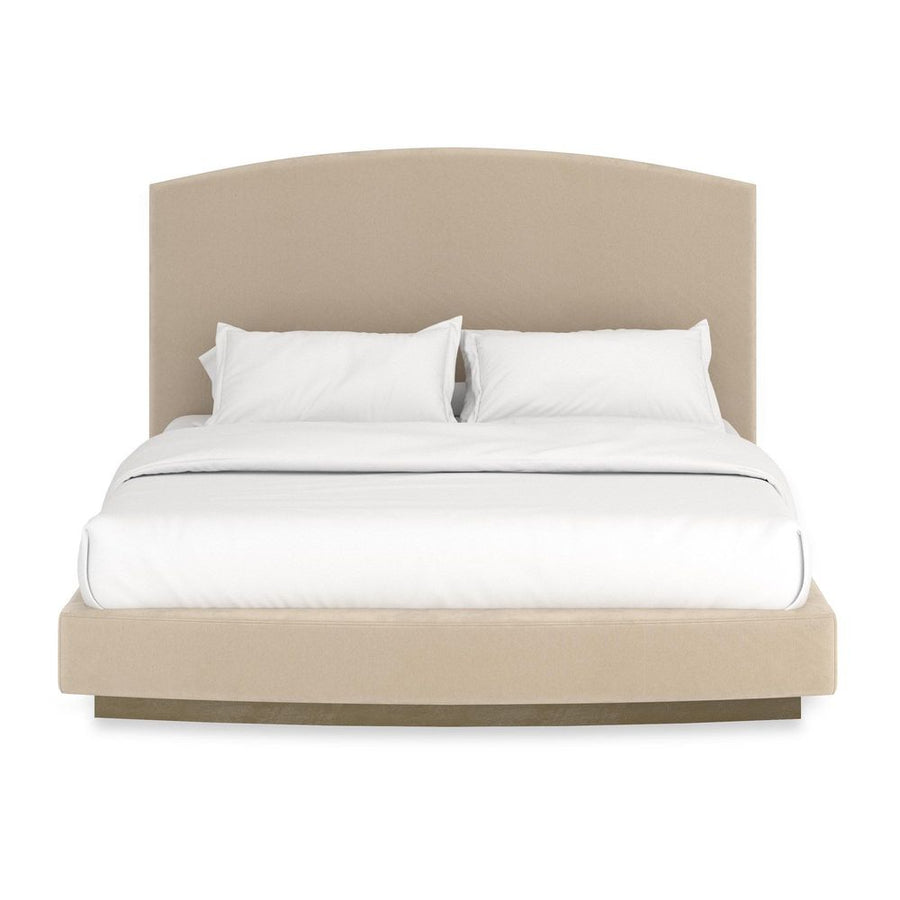 Classic French forms have been contemporized in this upholstered bed with ultra-clean lines. The tall headboard is elegantly arched to mimic the curve on the front of the platform. The bed is enveloped in smooth, pumice-colored performance faux suede with a wood plinth base that glistens in Brushed Gold paint. Available in Queen and King sizes.