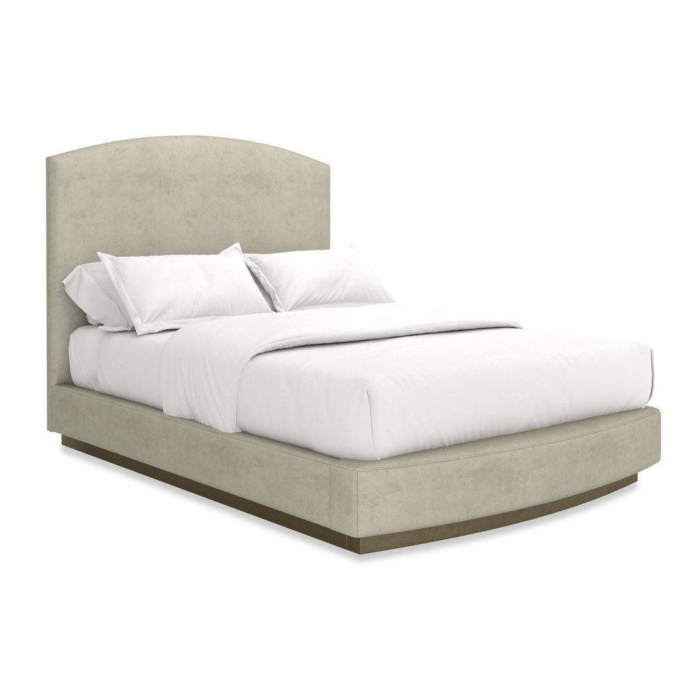 Classic French forms have been contemporized in this upholstered bed with ultra-clean lines. The tall headboard is elegantly arched to mimic the curve on the front of the platform. The bed is enveloped in smooth, pumice-colored performance faux suede with a wood plinth base that glistens in Brushed Gold paint. Available in Queen and King sizes.