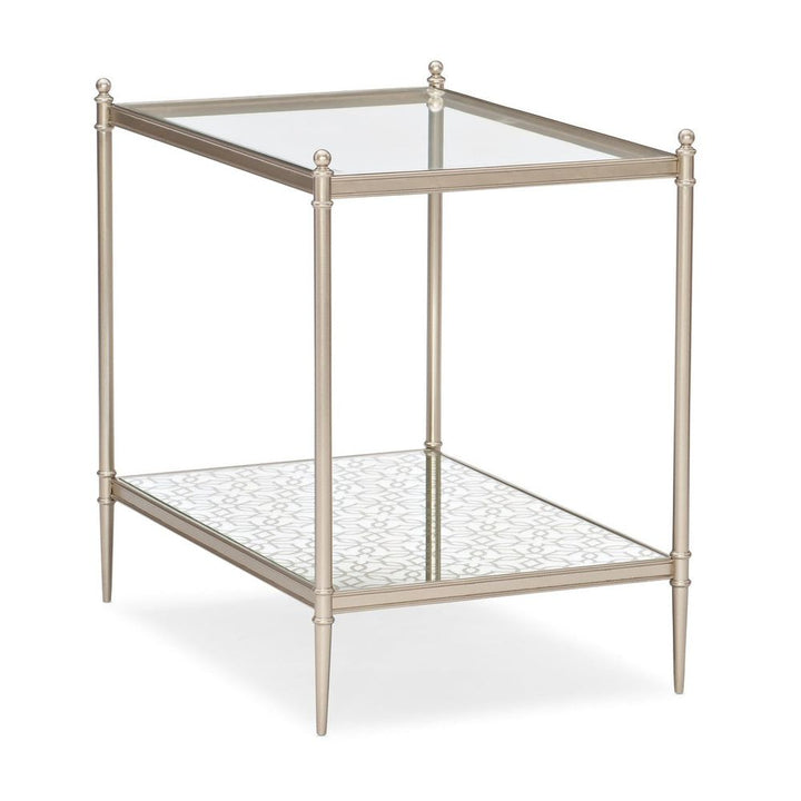 Perfectly balanced in every way, this brilliant table is a true essential. Minimal by design, its streamlined form is smartly scaled and designed to blend seamlessly into any setting. Its modern mix of materials includes a clear glass top, a metal frame finished in Neutral Metallic, and a lower shelf crafted of a back-painted mirror featuring a Silver Leaf pattern. For storage, serving or display this stylish piece fits the occasion.