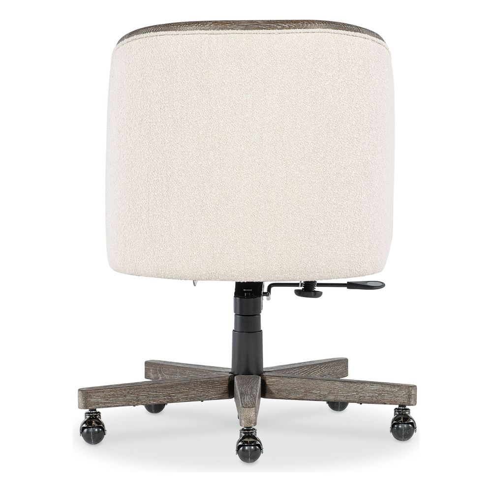 Description: Discover the Vespera Executive Swivel Tilt Chair in the timeless Mink finish, designed by FAS Traditions Upholstery for contemporary home office spaces. Featuring a barrel back design with wire-brush detailing in dark, earthy tones, this chair exudes a classic aesthetic. Upholstered in Inverness Natural fabric with easy-care properties, it offers adjustable height, swivel motion, and a sturdy dark wood trim and base. Ideal for professionals seeking comfort and style in their home workspace setup.