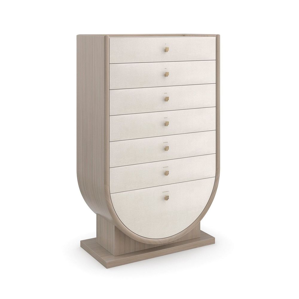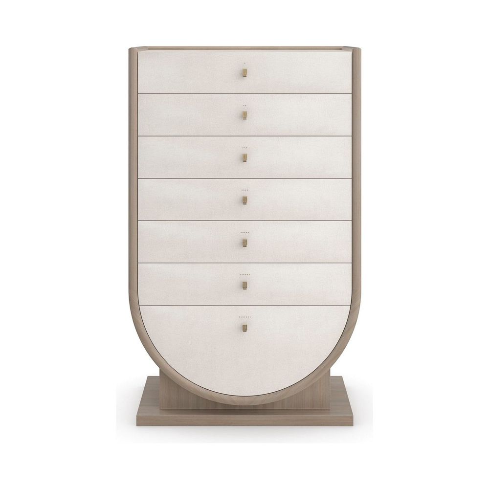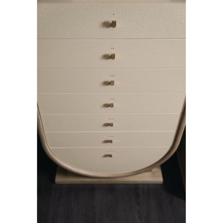 Drawing the eye with its striking shape and height, this semainier chest lets you create a one-of-a-kind, sensory experience. With a graceful form inspired by Grecian pottery, it features seven drawers, one for each day of the week, notated by corresponding brass brads and tactile hardware that can be seen and felt, even in low light. Perfect for keeping lingerie and linens, its Ivory Craze finish adds to its alluring texture and elegant presence.