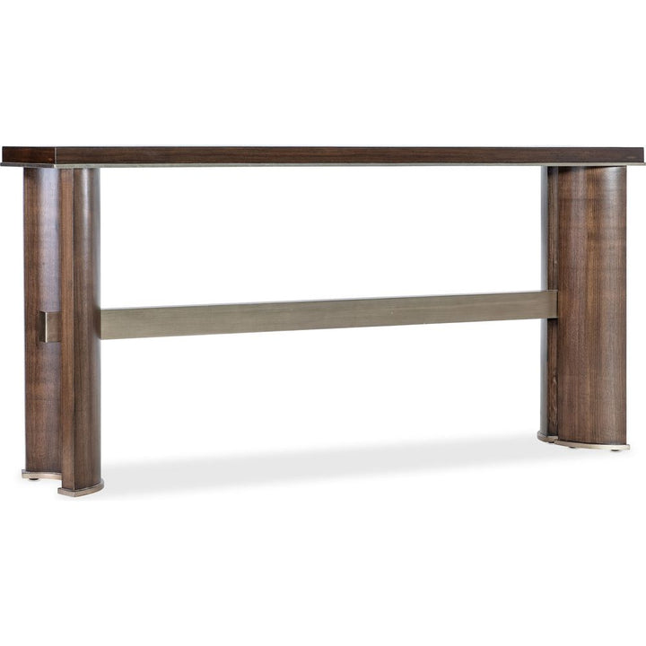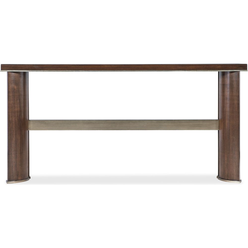 Description: Classy and timeless, the Contours Console combines Walnut Veneer construction in a matched veneer pattern on top with a champagne-finished stretcher and accent trim. Featuring a narrow rectangle shape and concave-shaped legs, it has a narrow rectangle shape measuring 68 inches wide x 15 inches deep.