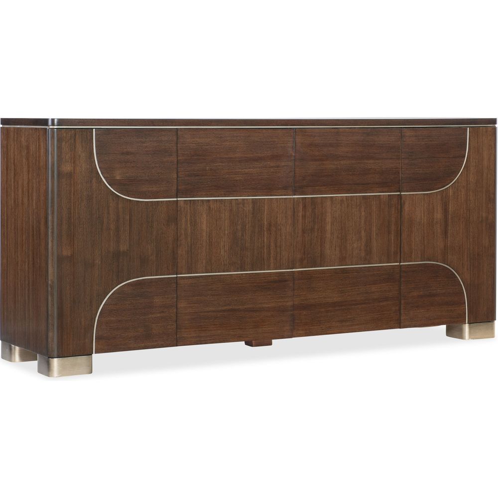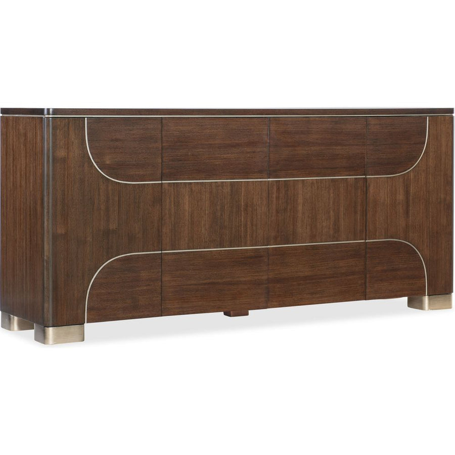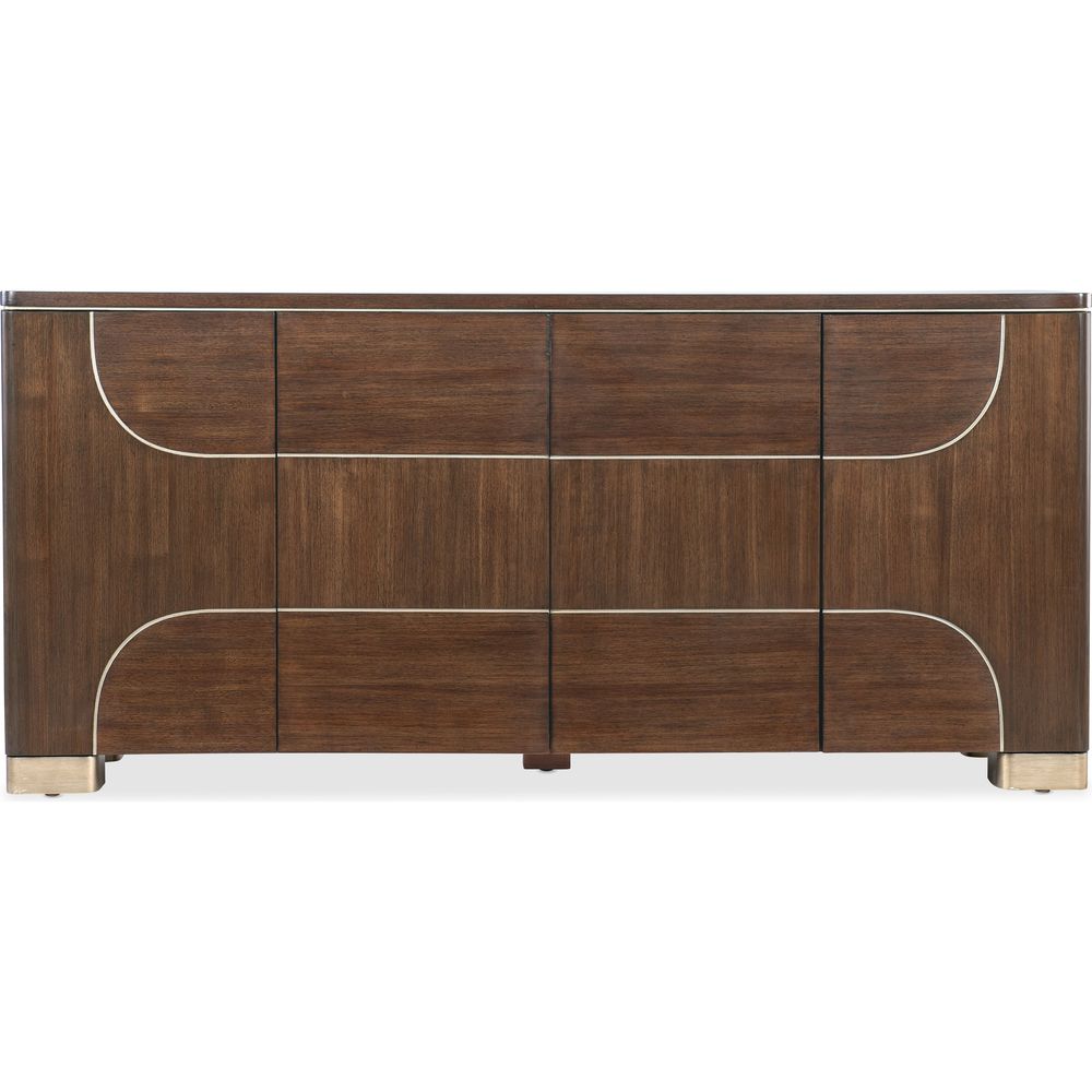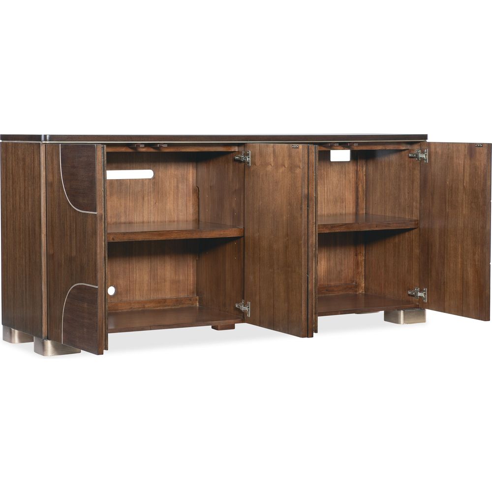 Description: A dark walnut finish with a contrasting veneer pattern is accented with champagne trim and feet on the Vibrance Contours Credenza. Crafted of Walnut Veneer in a Dark Walnut finish, the credenza has four touch latch doors with soft close hinges and one adjustable wood shelf behind each pair of doors. There's a ventilated back panel and wire management behind each pair of doors, making this piece media-friendly.